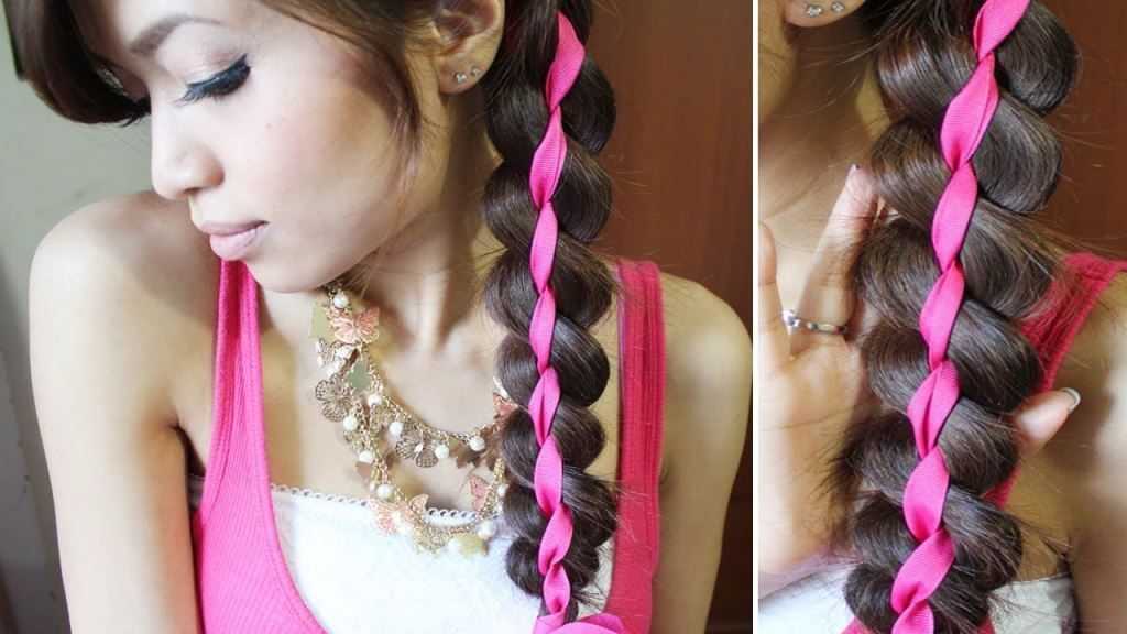 Для создания этой укладки подходит абсолютно любой вариант плетения. Во время работы просто нужно добавить в прическу ленточку выбранного цвета. Место добавления и ее цвет следует выбирать исходя из личных предпочтений, расцветки одежды и повода.