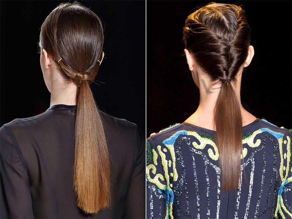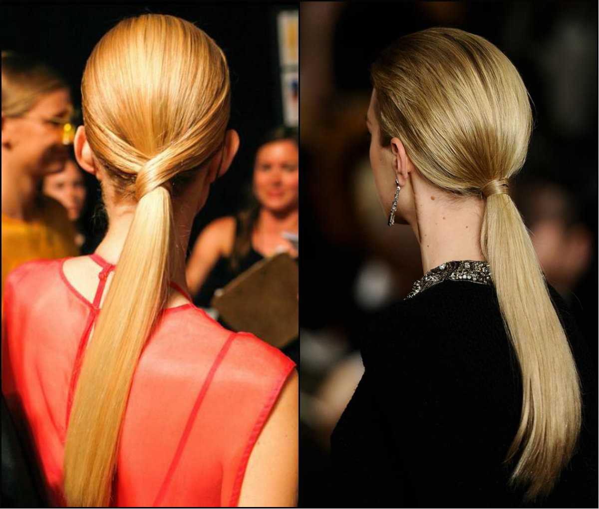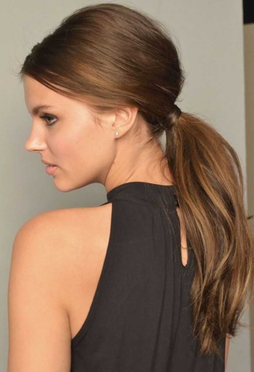 Быстрая прическа – низкий хвост с прямыми волосами. Закрепить можно черной резинкой и затем закрыть прядкой из хвоста.