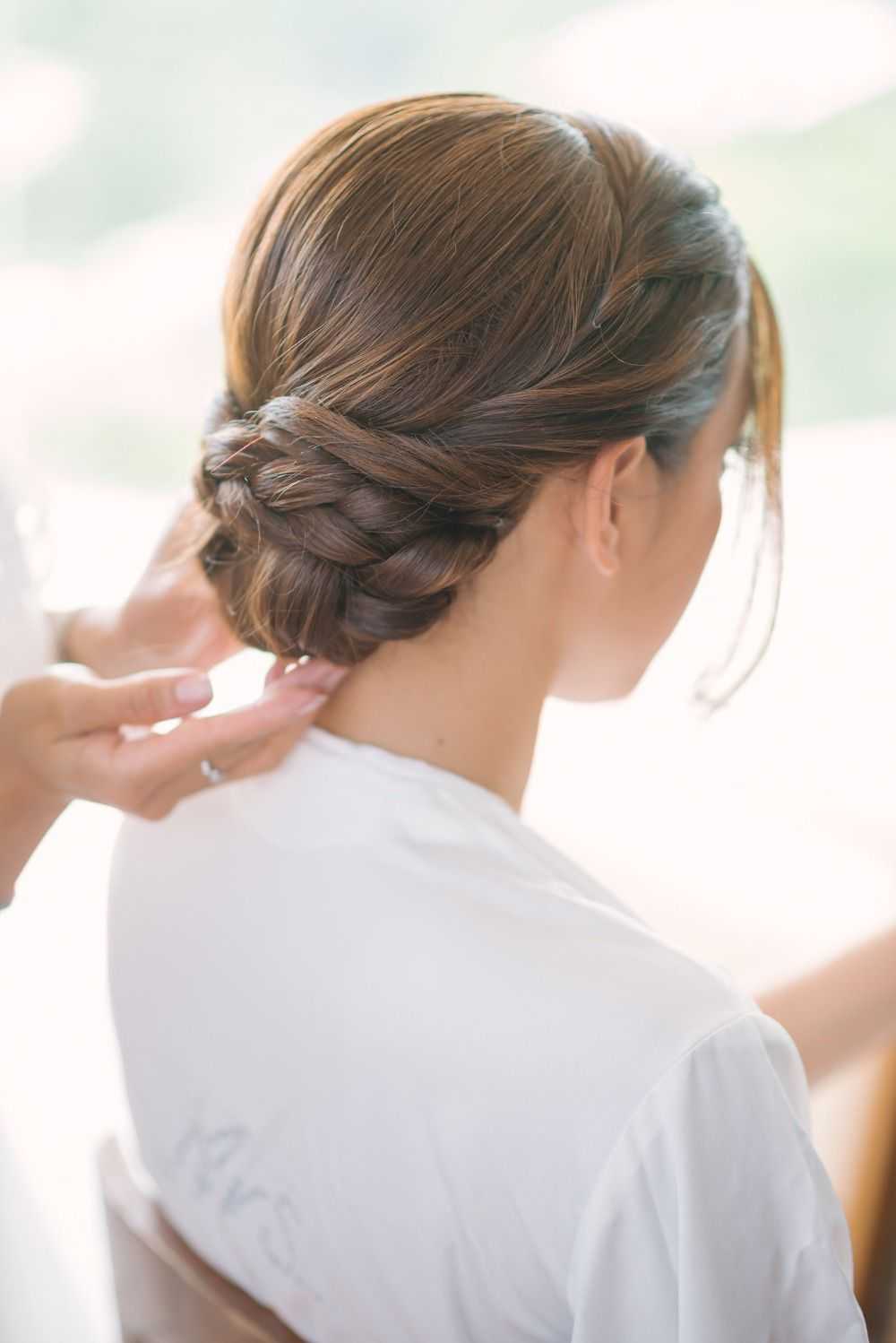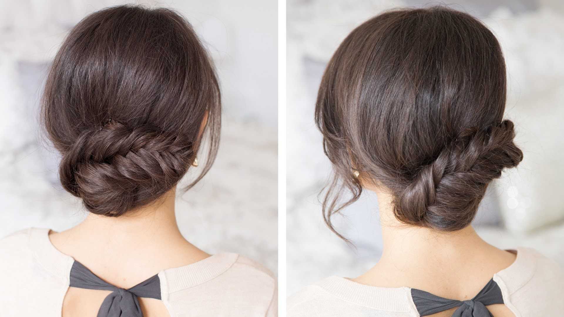 Альтернатива пучку – волосы заплетены в косу и подвернуты в области шеи. Закрепить конструкцию можно шпильками или невидимками в цвет волос. На длинных локонах такую прическу не сделаешь – не получится спрятать косичку, а для средних достойных вариант.
