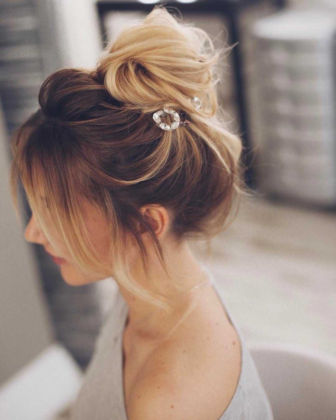 Прическа для торжественных случаев, которая поможет выглядеть визуально выше. Высокие пучки идеально подходят обладательницам волос одинаковой длины, которые не будут выпадать из прически. Тренд последних сезонов – пучки с элементами плетения. Косички, которые аккуратно вплетаются в пучок, великолепно выглядят в деловых образах.
