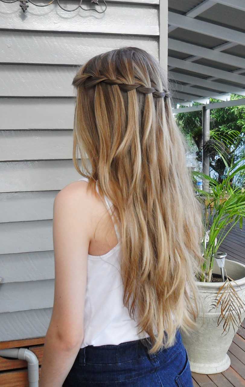 Чтобы вам не мешали слишком длинные ниспадающие участки, соорудите в верхней части головы водопад. Пропустите несколько сантиметров для демонстрации струящихся волосков. А ниже соберите оставшуюся массу в одну общую трехпрядную косу. Немного ослабьте ее.