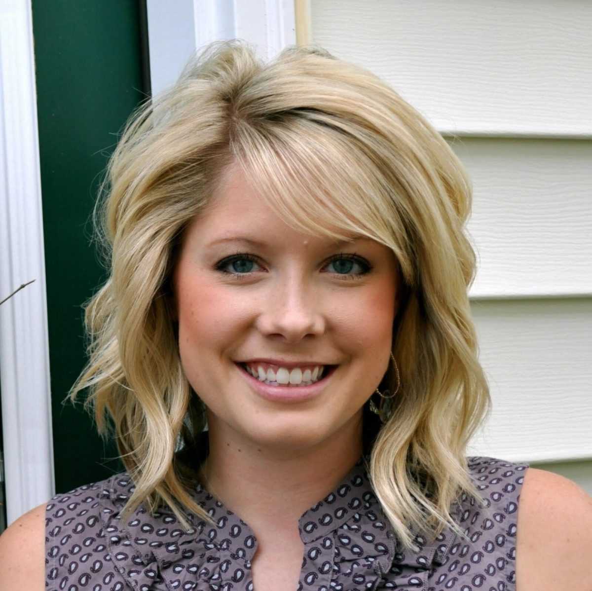 При средней длине волос хороший выбор — косой пробор и объемная челка. Боковые удлиненные локоны зрительно вытянут лицо, небольшой объем волос на висках создаст эффект правильного овала лица.