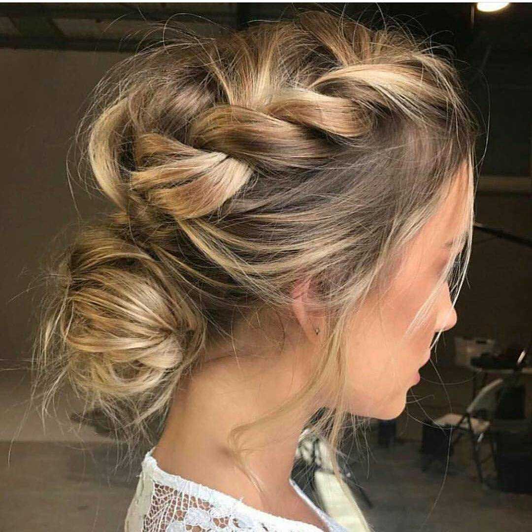 Другой вариант подобной укладки можно выполнить с бубликом, а ее итог красиво подвести с помощью двух косичек, обрамляющих пучок.