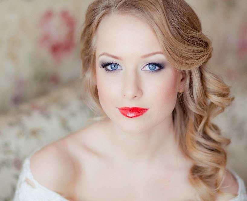 Светловолосым девушкам подходит персиковая гамма в макияже. Румяна, помада и тени не должны быть слишком контрастными к коже невесты. Но для более выразительного макияжа, особенно при спокойном мейк-апе глаз, акцент стоит делать на губы и выбирать более сочные оттенки.