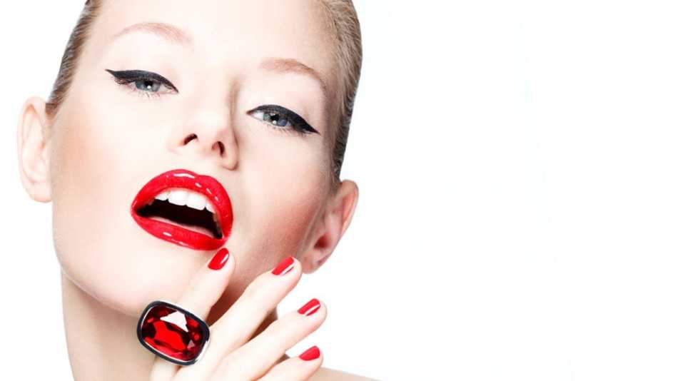 Красная помада в макияже для губ отлично сочетается с красным маникюром