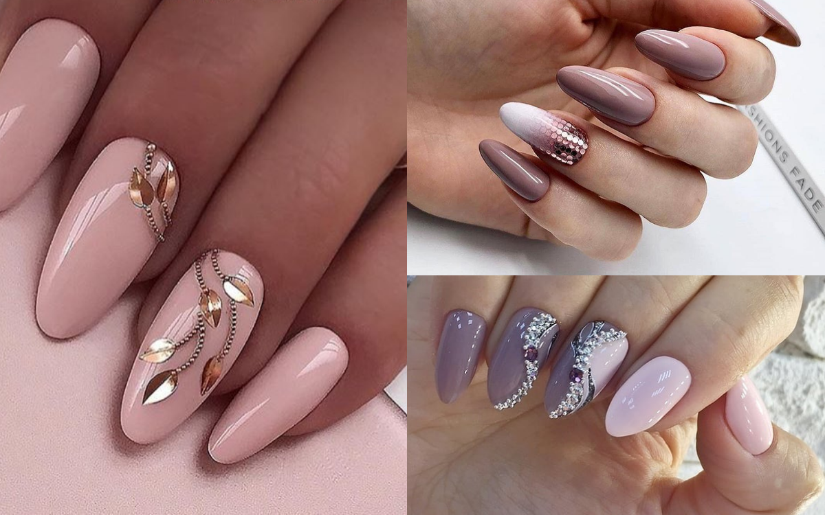 Куда же без этих украшений! С блесками и стразами бежевый маникюр смотрится ярко и эффектно. Но результат напрямую зависит от количества размещенных блесточек и страз. Чем больше их на ноготке, тем смелее можно утверждать, что маникюр претендует на звание праздничного.