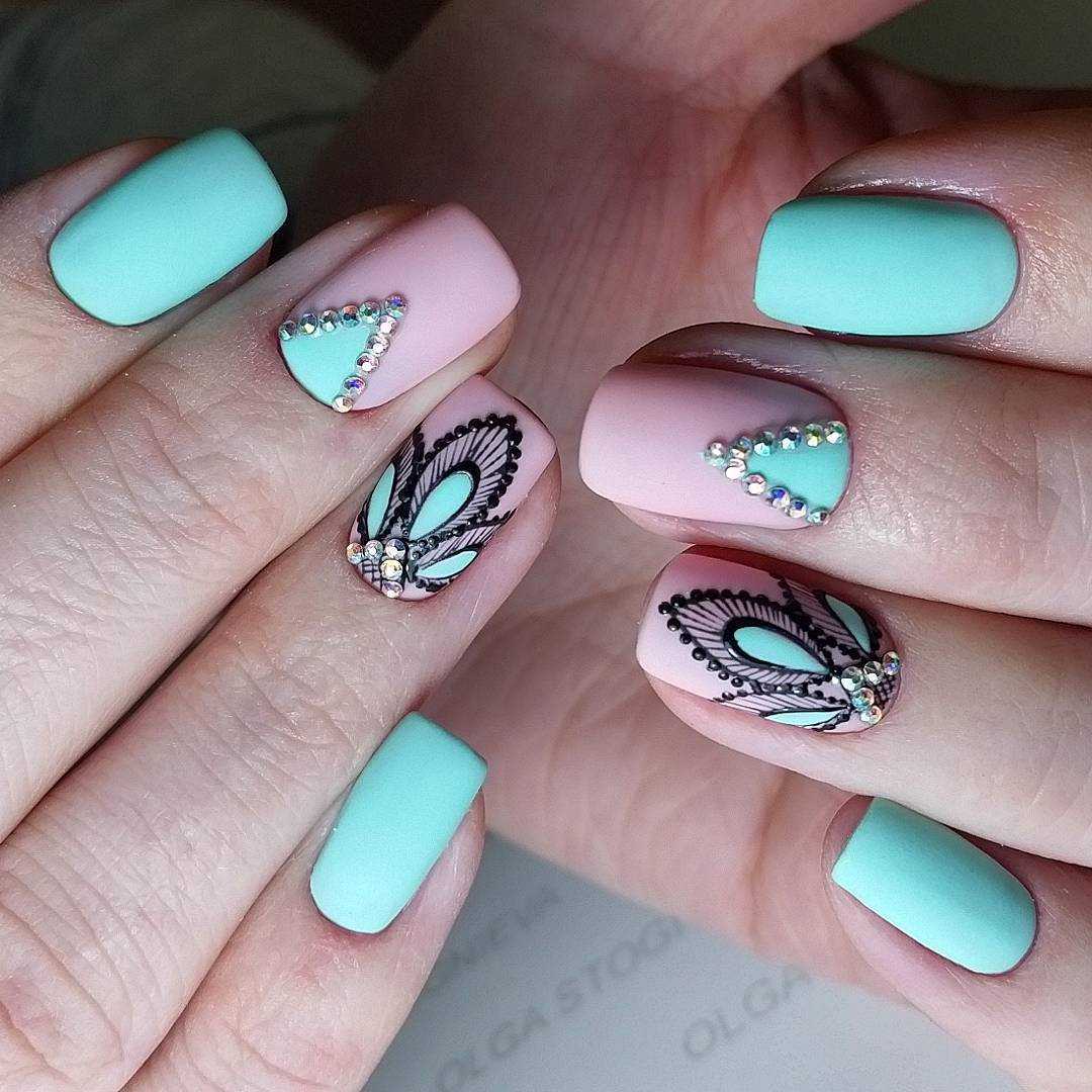 Особенно интересно выглядит кружевное оформление в черно-бирюзовом цвете. При этом можно использовать любой цвет в качестве прорисовки узора. Дополните такой дизайн черными мелкими стразами для окантовки узора, используйте вместо кружева узоры мехенди. Такой дизайн существенно отличается от классических пастельных нейл-артов, в большей степени благодаря контрастности и оригинальности узора.