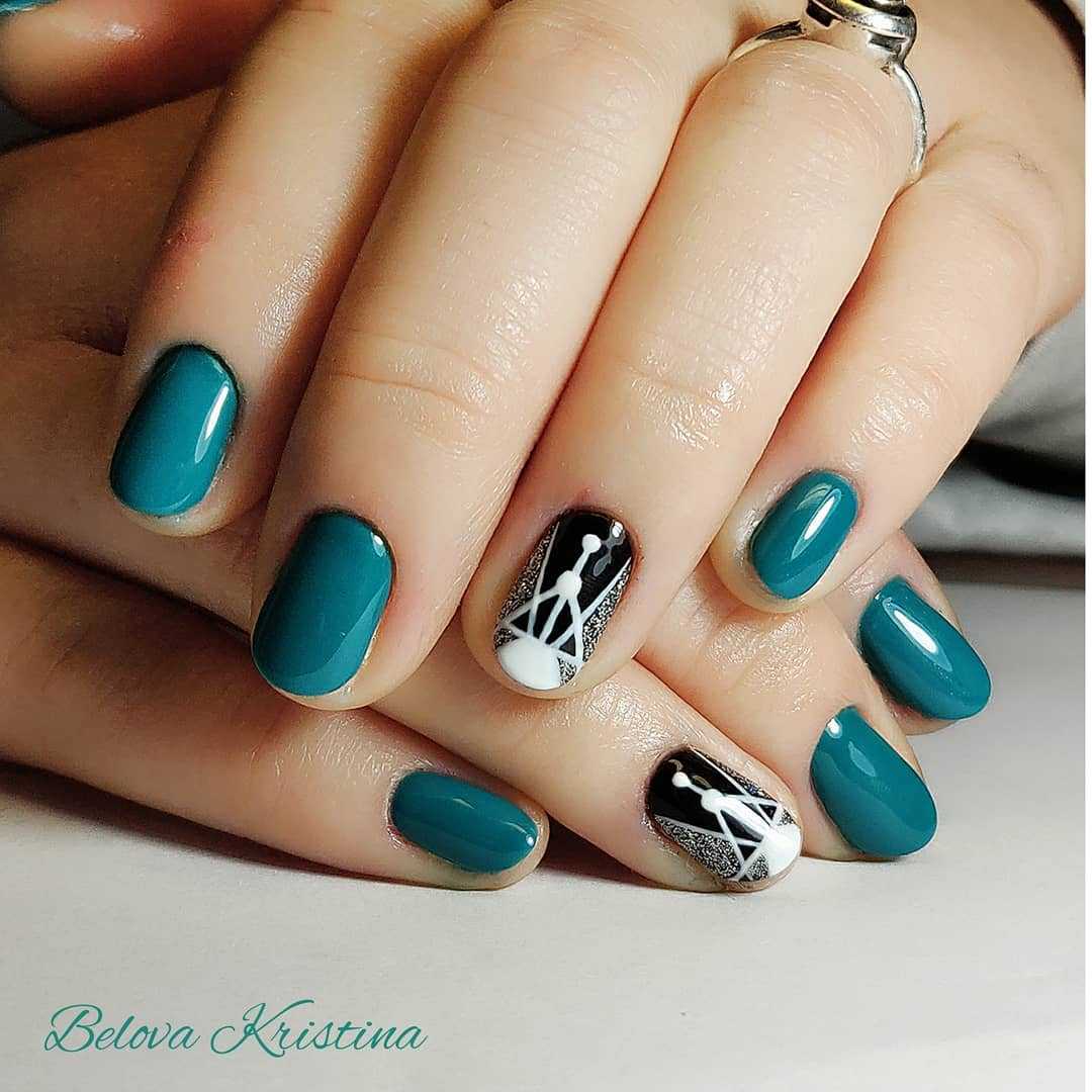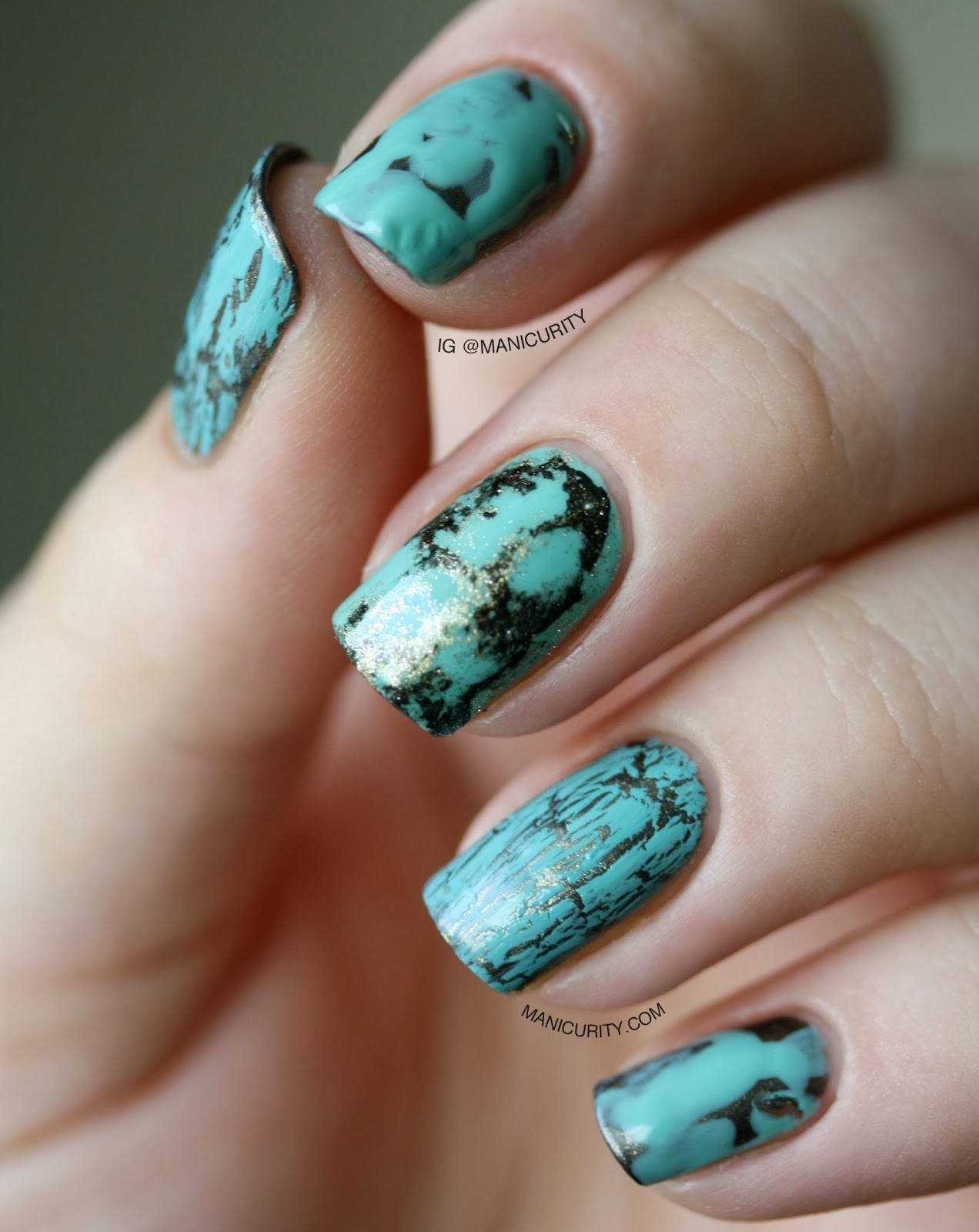 Идей черно-бирюзового маникюра огромное количество. Это могут быть аккуратные полоски черным цветом на бирюзовом фоне, отпечатка бирюзовой фольгой на черном фоне, рисунки-оригами в черном цвете на бирюзовом ноготке.