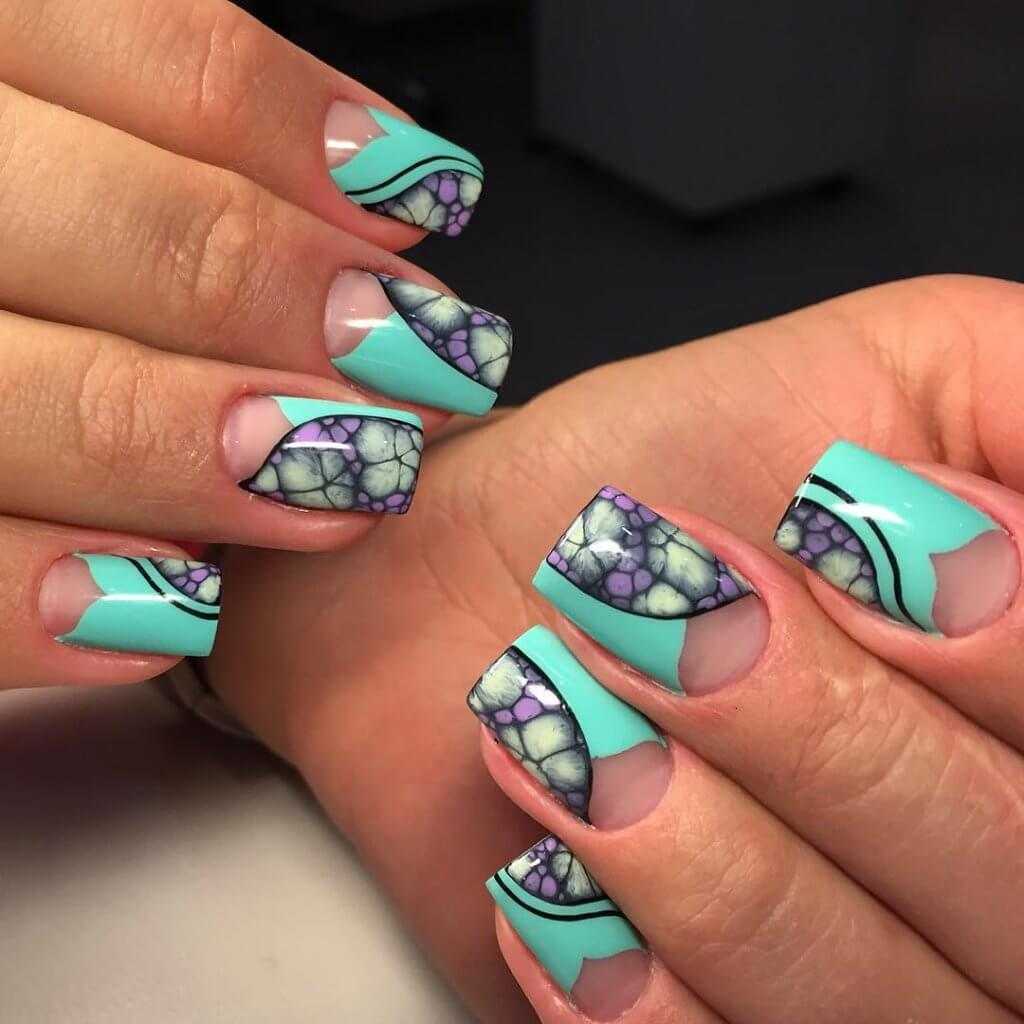 Камуфлирующие витражные цвета модно носить как самостоятельное покрытие, можно использовать в дизайнах стемпинг, слайдеры, акварель. Преимущество лучше отдавать морским, цветочным и растительным узорам.