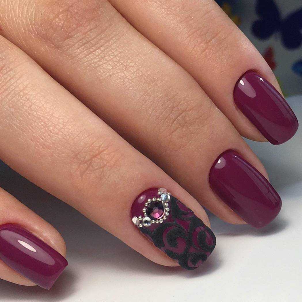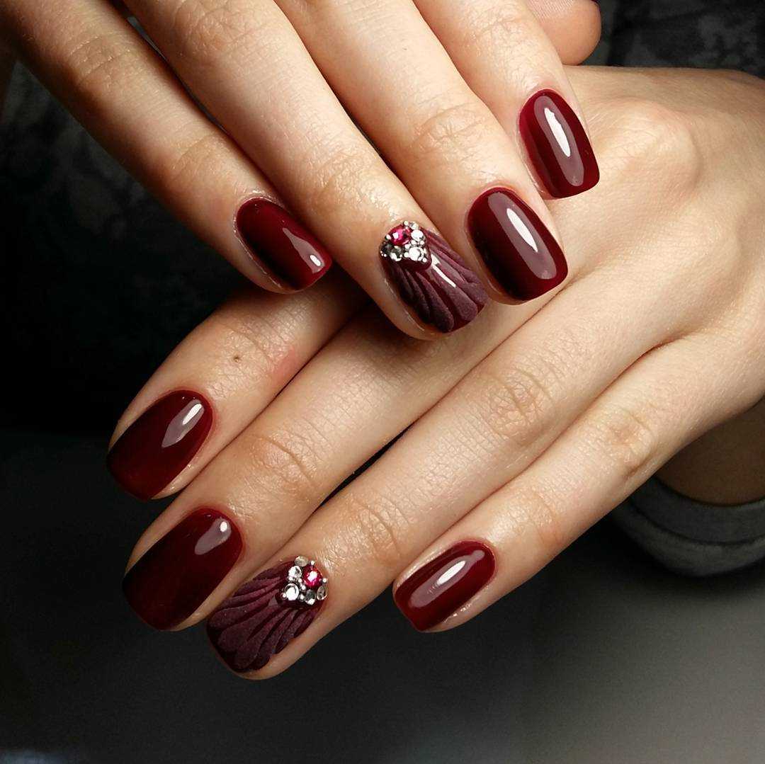Одним из самых изысканных маникюров считается бордовый маникюр со стразами. Прежде всего идет речь об однотонном покрытии. Ничего лишнего в дизайне кроме сверкающих кристаллов и камней. Однако визуальный эффект вызовет бурю страстей и восторга. Последней новинкой сезона стал декор стразами и бисером, выкладка в виде ювелирного украшения на ногтевой пластине. Работа требует времени, повышенного внимания и аккуратности, но результат того стоит.