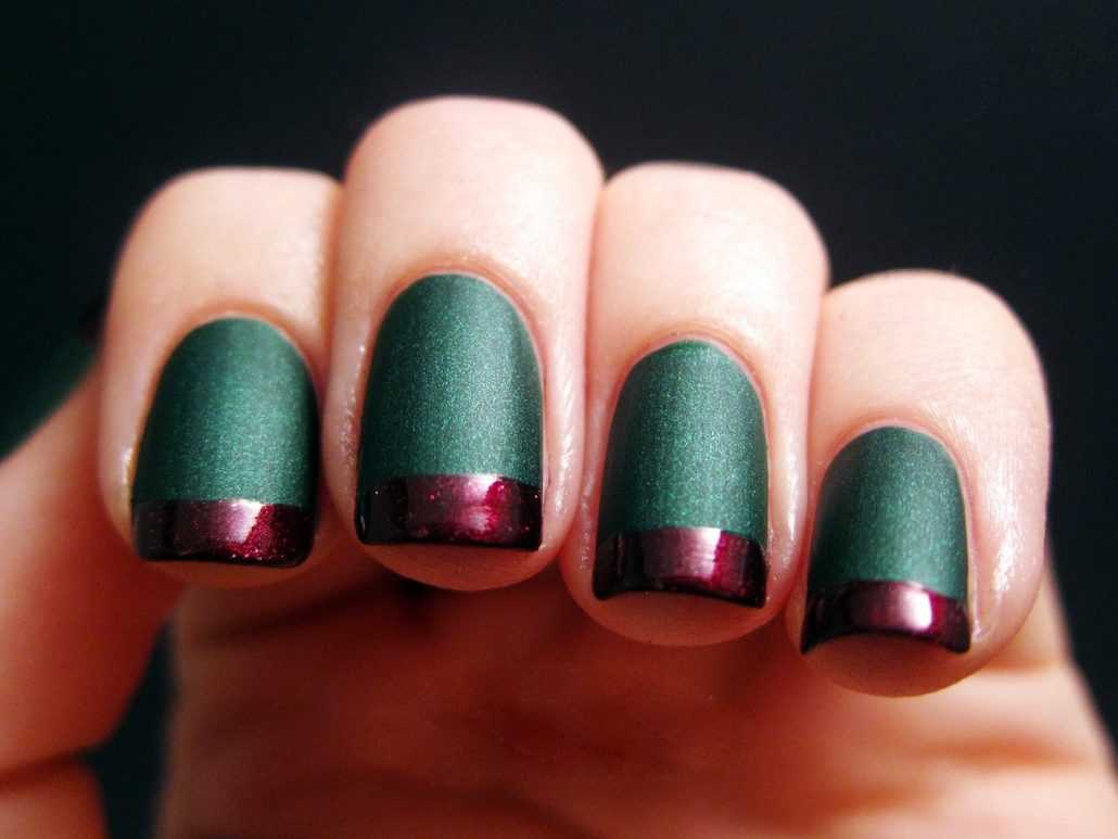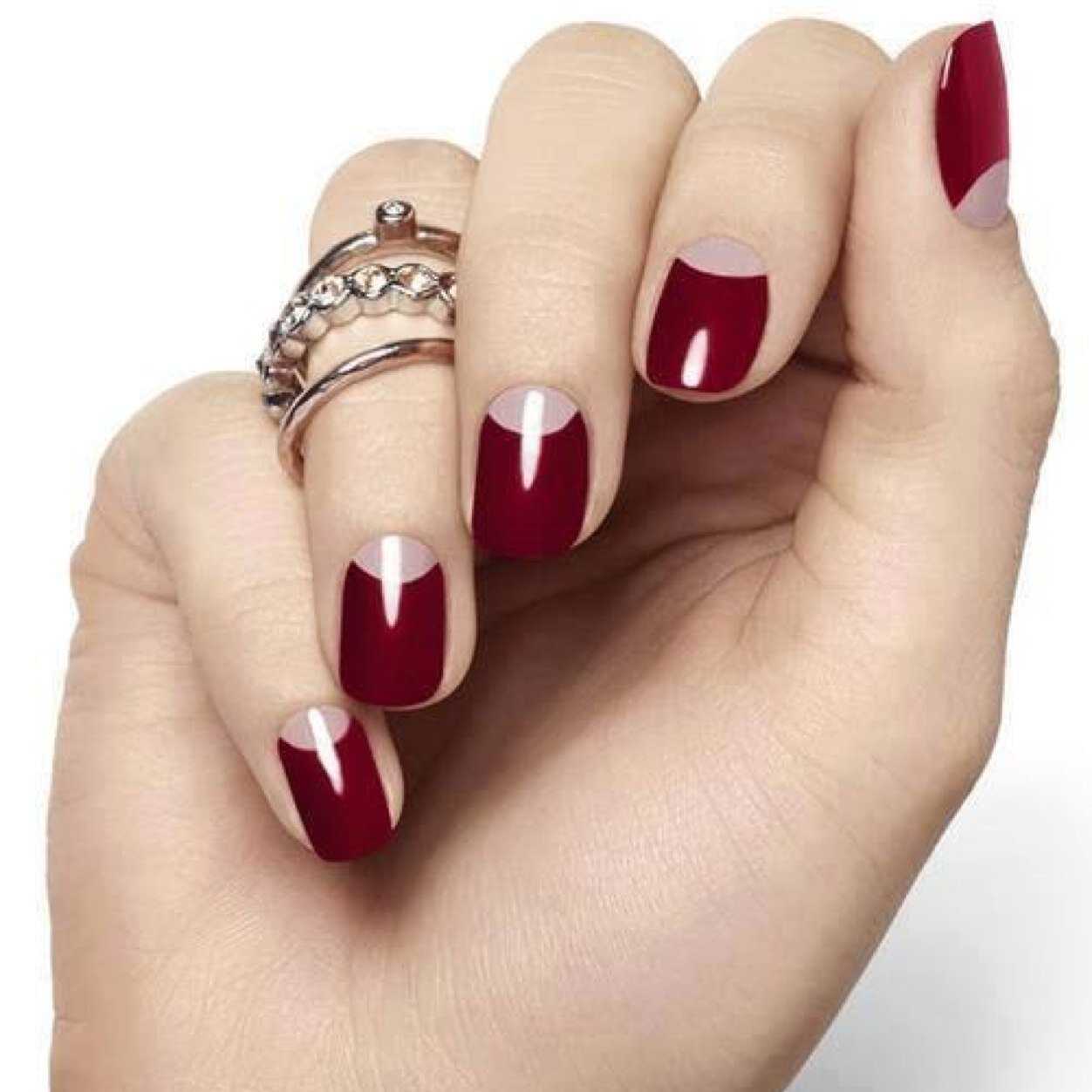 Тем, кто выбрал одну из таких техник, следует учесть один момент: если темным цветом выкрасить ноготь, а светлым отросший край, то ногти будут казать куцыми, а пальцы короткими. По той же технологии создают маникюр, где бордовым лаком выделают рамку по периметру ногтя.