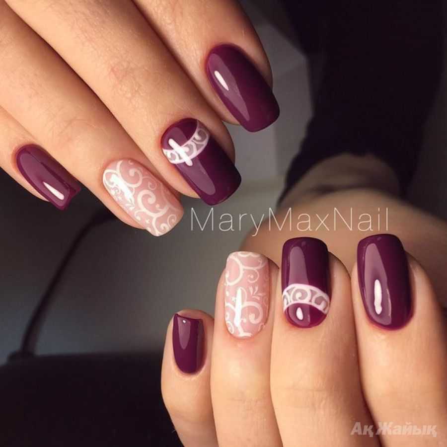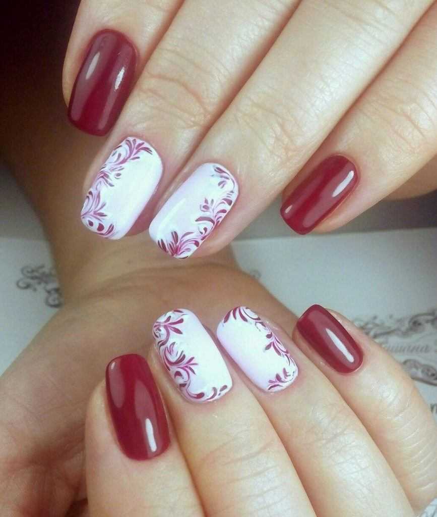 Белый и беж обычно добавляют в качестве декора – рисуют узоры и вензеля по бордовой основе. Маникюр смотрится нежнее и отлично дополняет романтический образ обладательницы.
