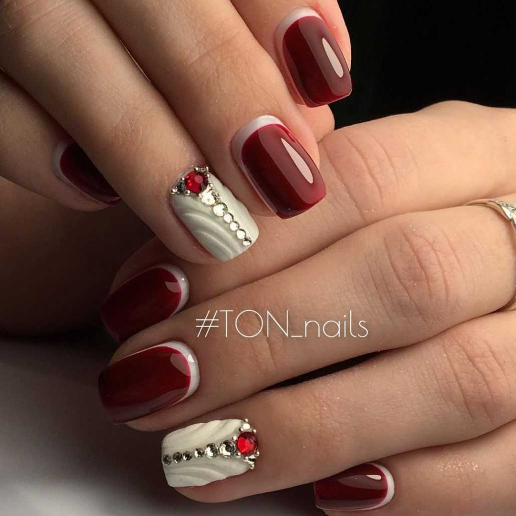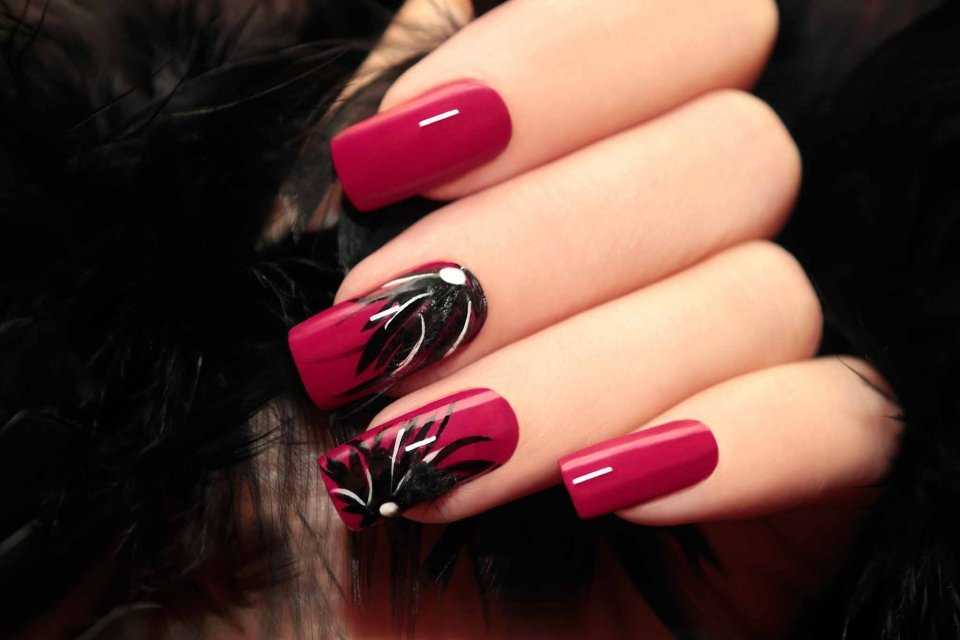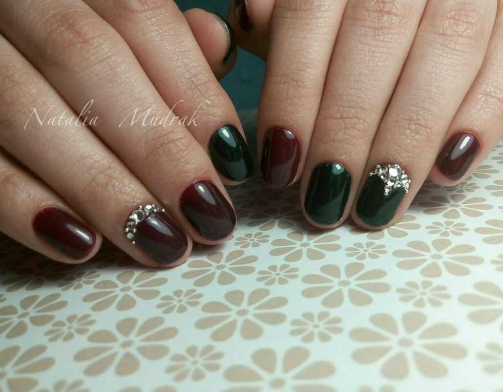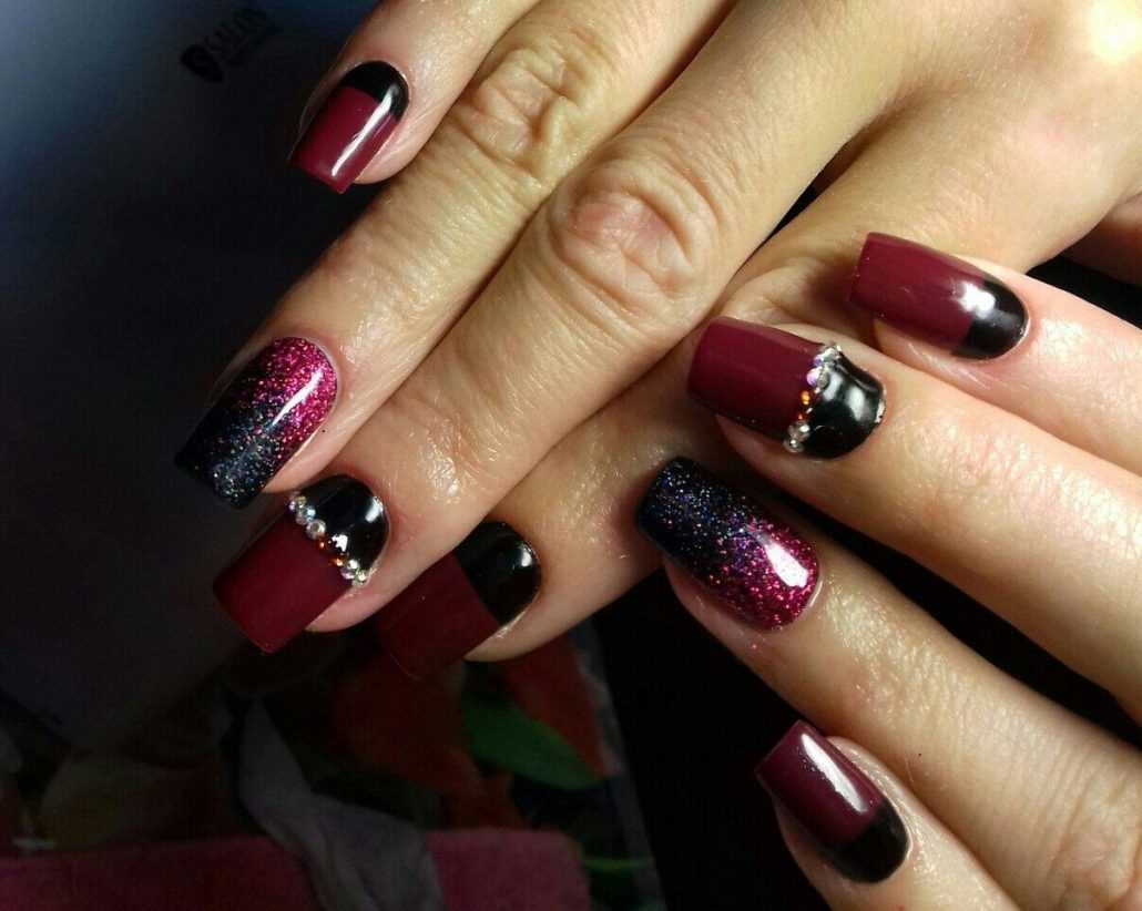Чередование винного и черного позволяет добиться максимального эффекта. Если уточнить и предложить вариант, то указательный и большой пальцы, окрашенные в черный, могут быть украшены стразами темно-красных типов.