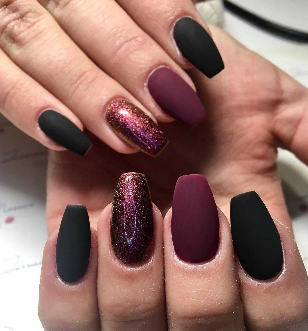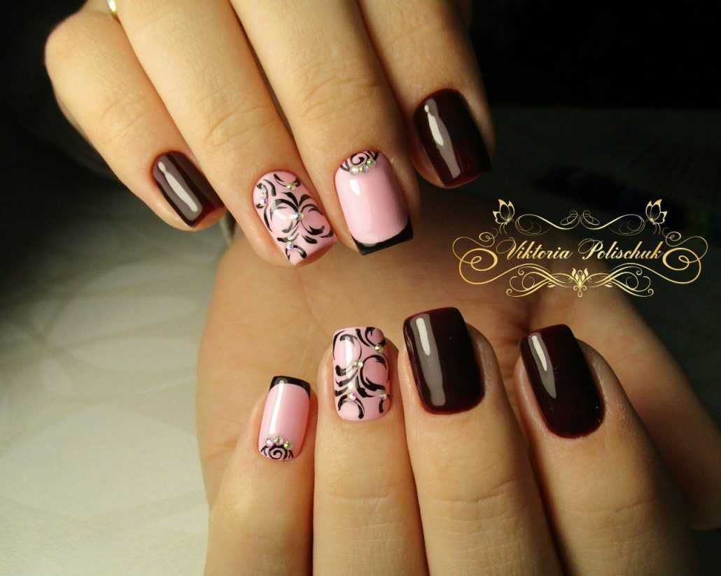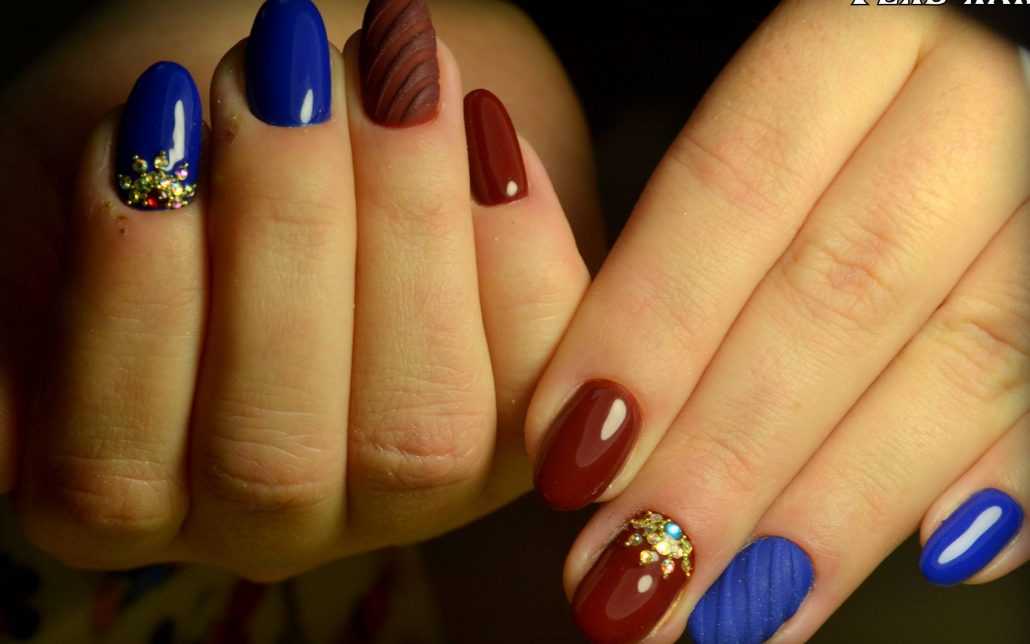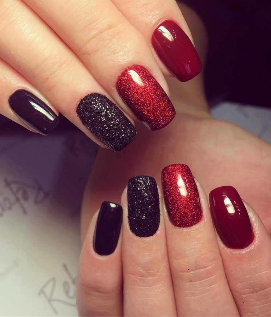 Чередование винного и черного позволяет добиться максимального эффекта. Если уточнить и предложить вариант, то указательный и большой пальцы, окрашенные в черный, могут быть украшены стразами темно-красных типов.