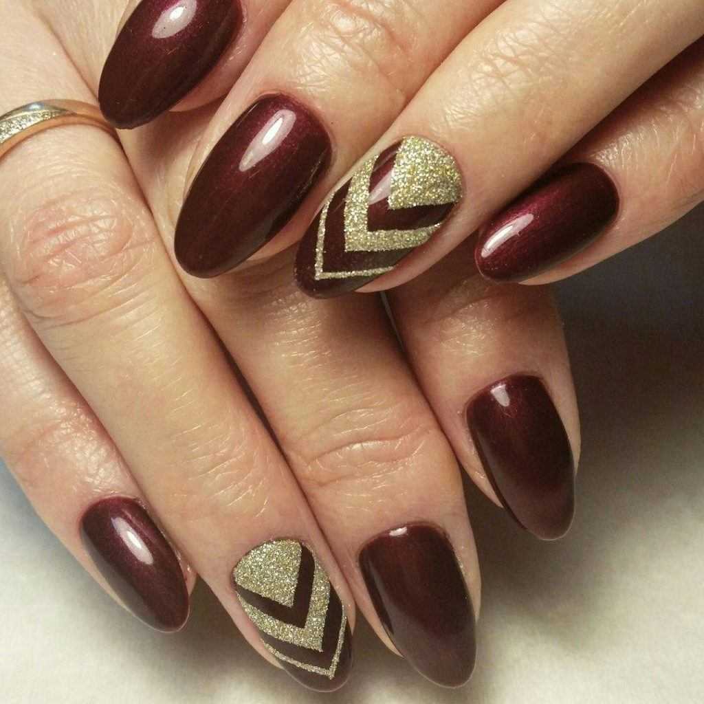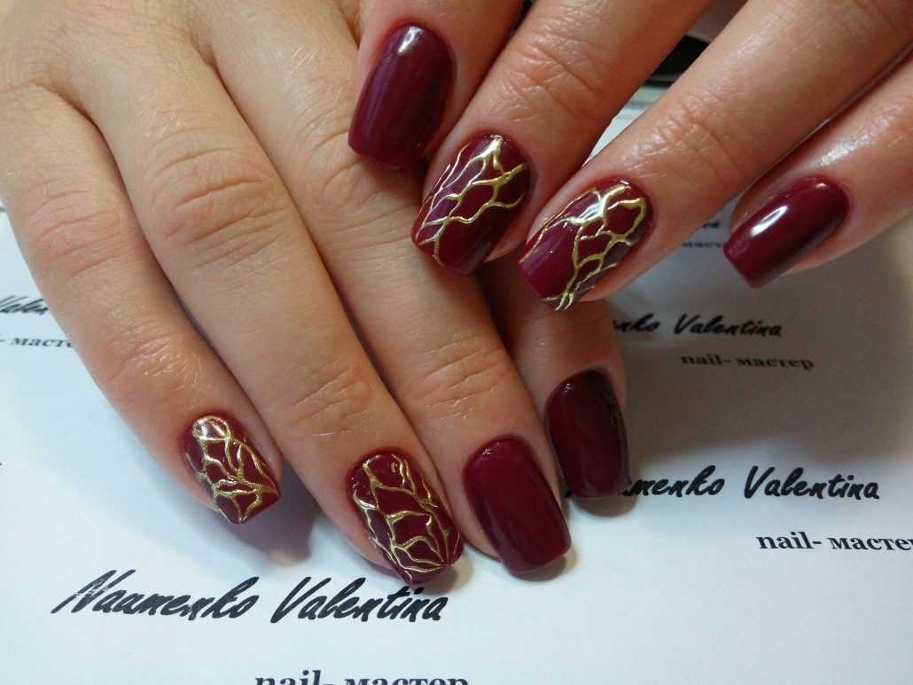 Сочетание бордового с серебром или золотом идеально для вечернего образа. Независимо от длины ногтя, маникюр будет выглядеть стильно и роскошно. Вариантов комбинации может быть много. Это может быть покрытие безымянного пальца золотым лаком, в то время как все остальные будут бордовыми. Золотистым можно украсить кончик бордового ноготка. А также можно нарисовать золотом любые рисунки на бордовом фоне.