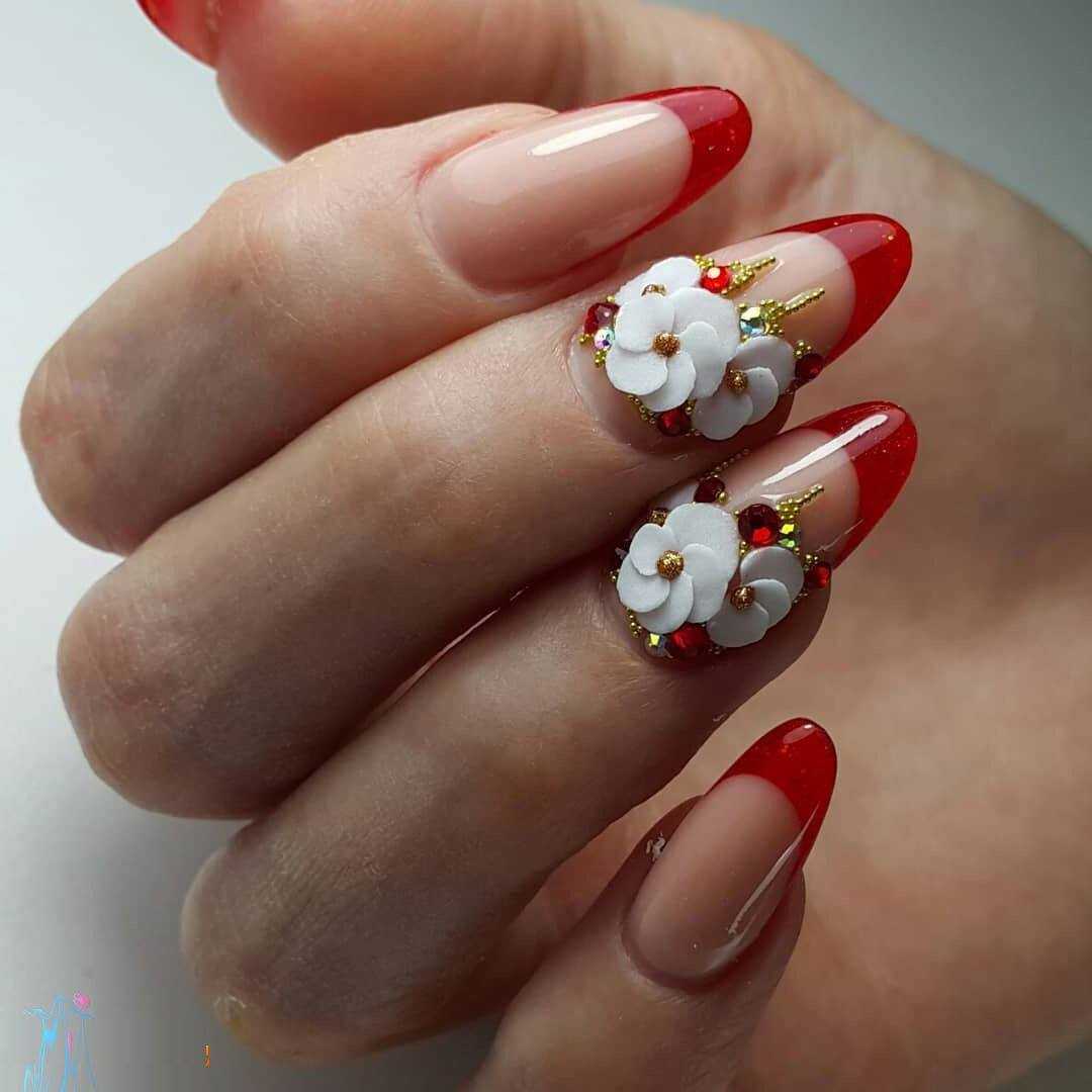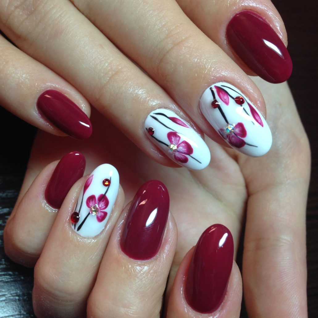 При этом не важно, как будут расположены рисунки: на нескольких ноготках или же на каждом пальчике. Еще один прекрасный вариант – покрыть все ноготки бордовым цветом, а один оставить прозрачным и выполнить на нем утонченную цветочную композицию из объемных цветов белого цвета