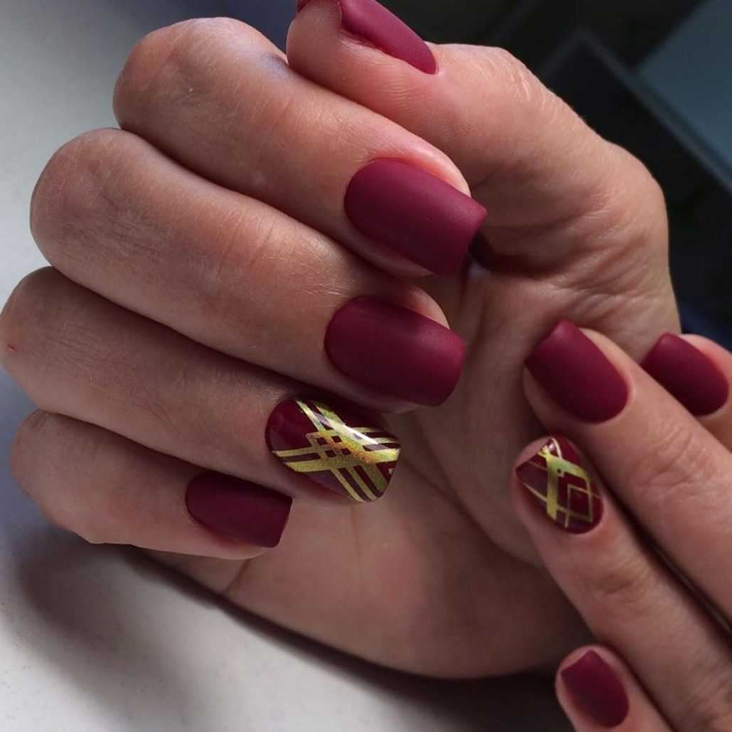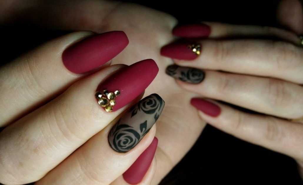 Маникюр в бордовых тонах с матовым дизайном наверняка будет оценен по достоинству яркими личностями, которые в восторге от шикарного нейл-арта. Подобного покрытия легко добиться с помощью специального лака для ногтей или обыкновенного пара.
