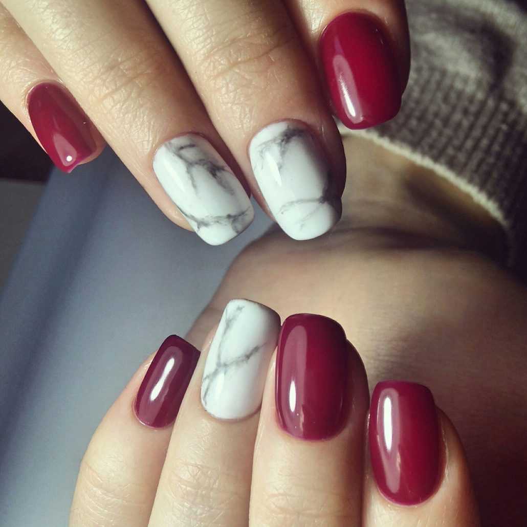 Дополнить насыщенность бордового могут разные оттенки. Прежде всего, это классические черный, белый и золотой. Украсить бордовый маникюр можно при помощи втирки, пудры или фольги.
