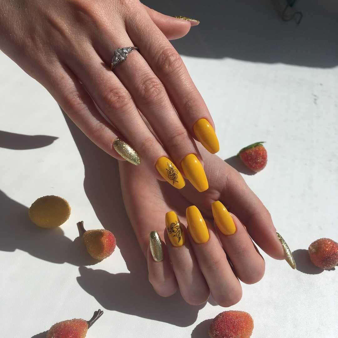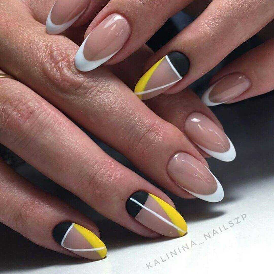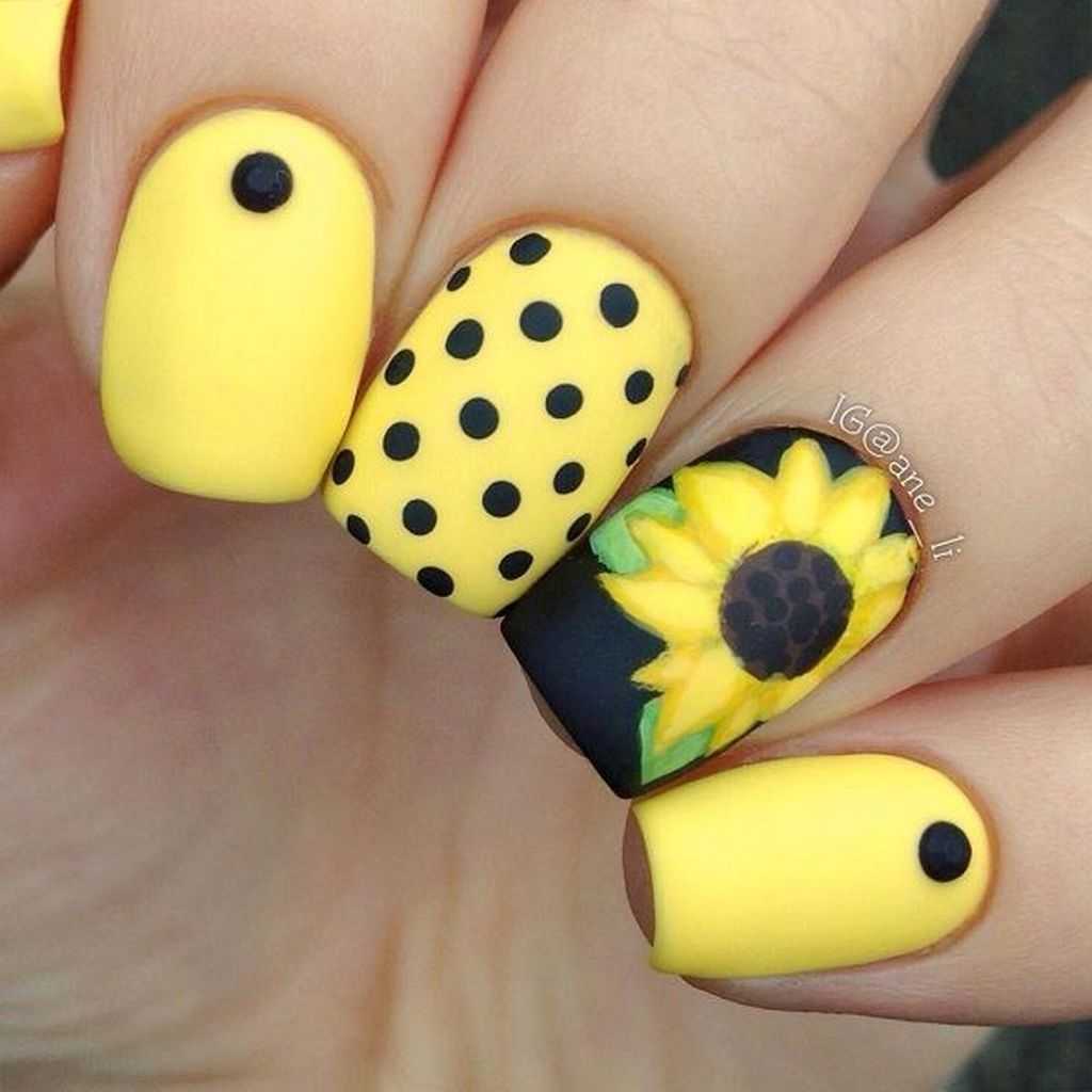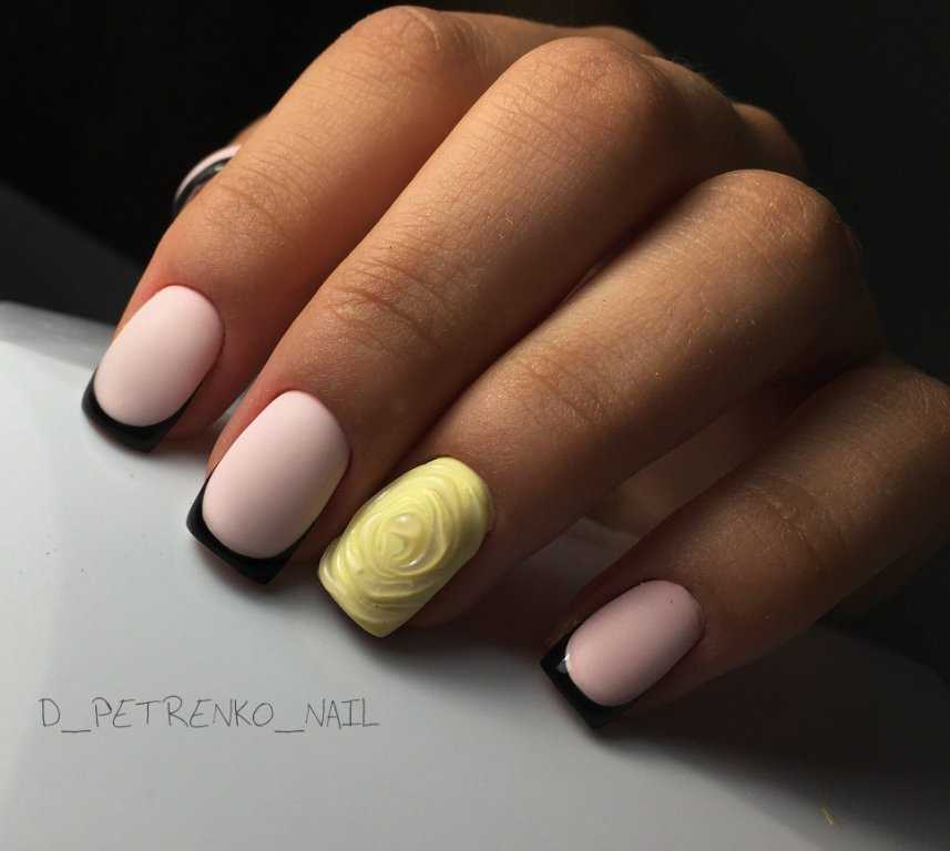 Матовый маникюр в черно-желтом цвете можно выполнить в нескольких вариантах: