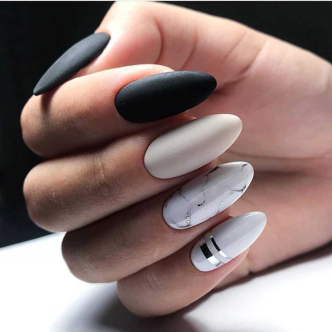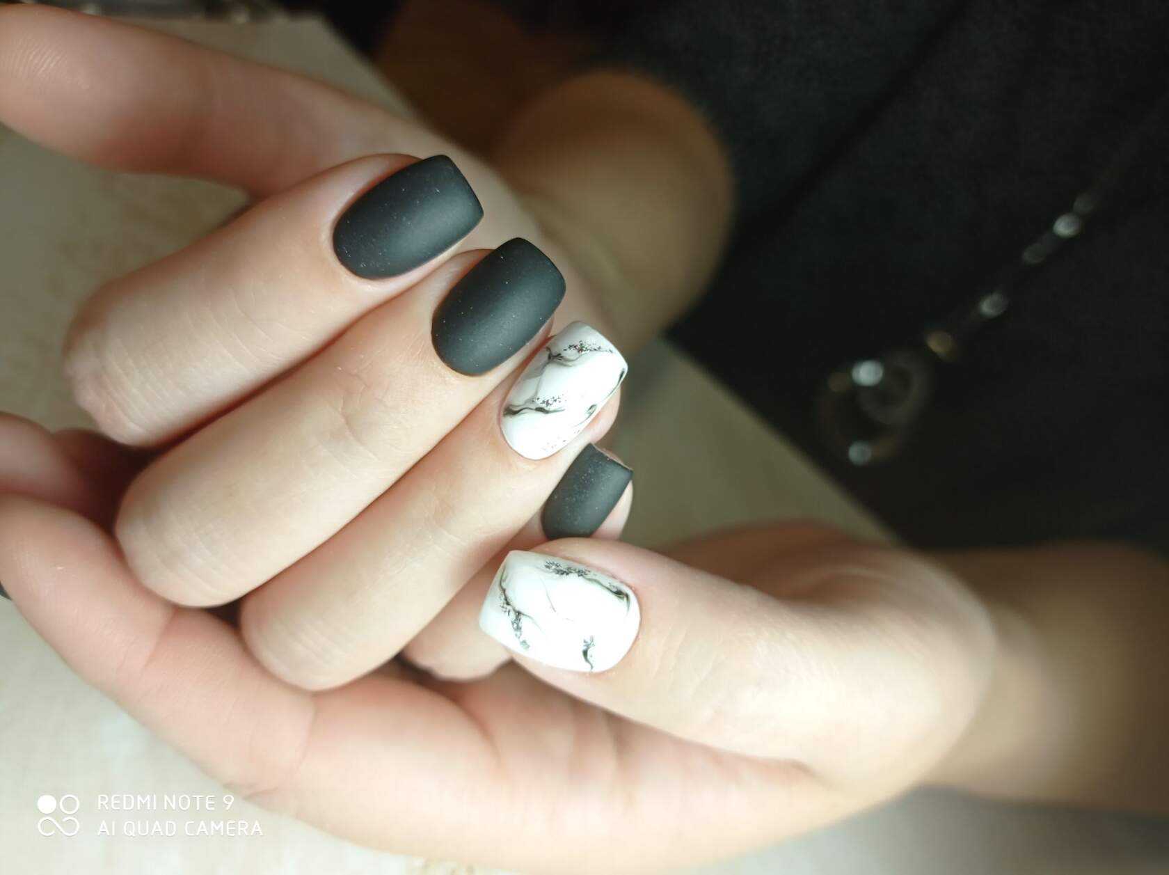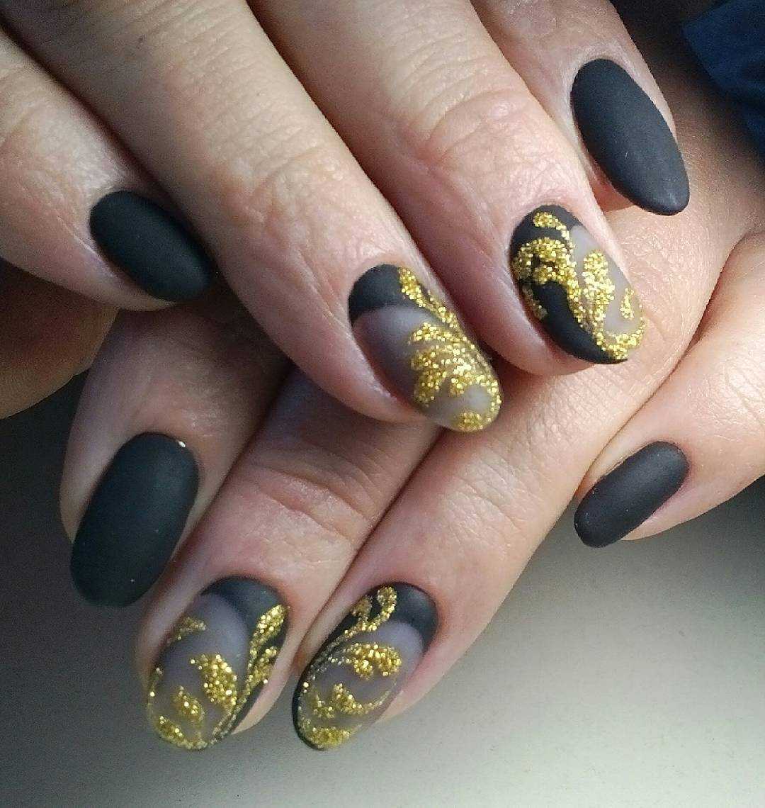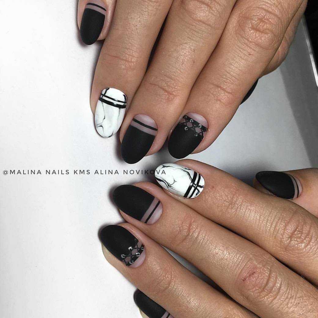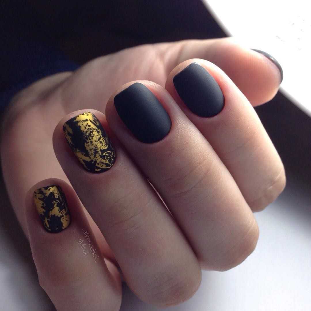 Глянцевое покрытие не является единственным вариантом демонстрации благородства и элегантности чёрного цвета. Матовая текстура в этом случае смотрится не так ярко и при этом прекрасно сочетается со многими деталями декора, которые подбираются по вашему усмотрению. Симпатичные комбинации из страз у основания, полное покрытие хрустальной крошкой в тон лаку безымянного пальчика, блестящие золотистые или серебристые металлизированные полоски, контрастные рисунки, комбинированный дизайн с глянцевыми узорами, а также удивительная идея маникюра в стиле «разные ручки». Не бойтесь экспериментировать.