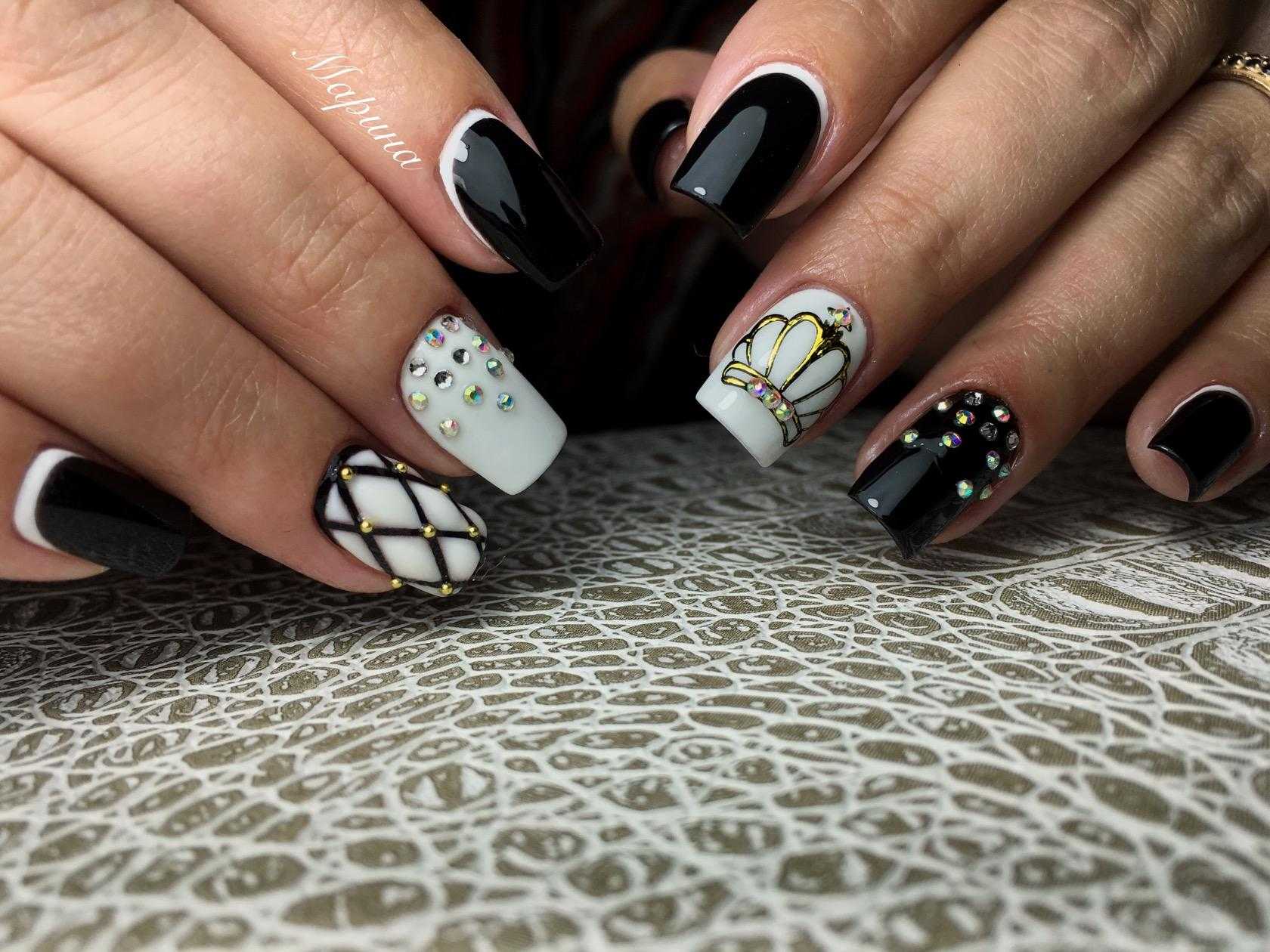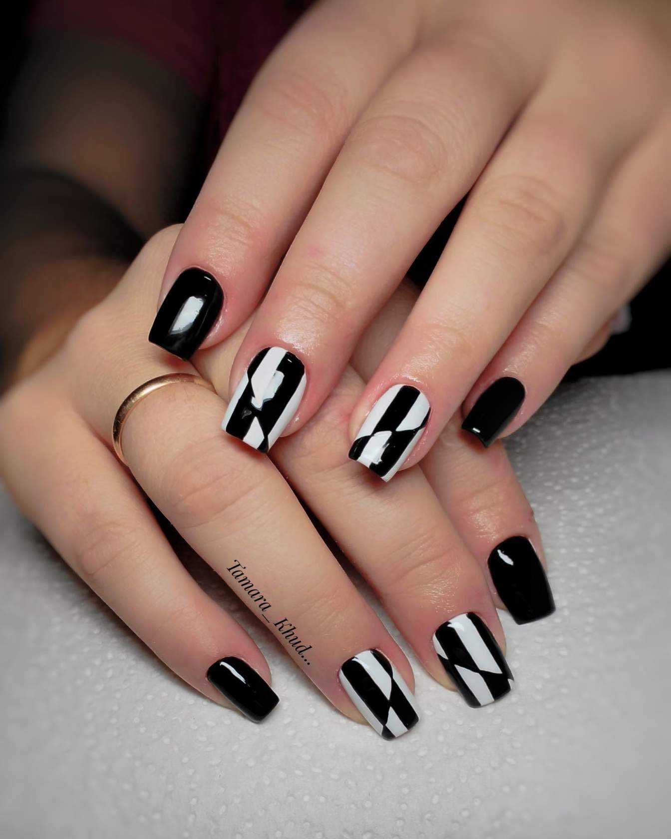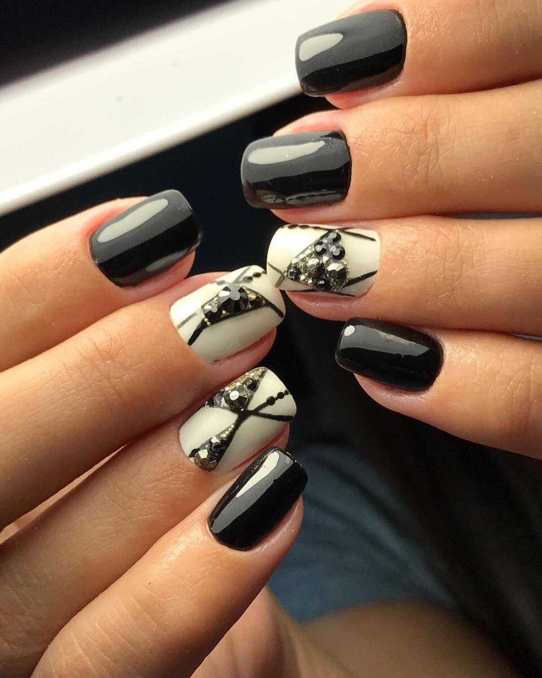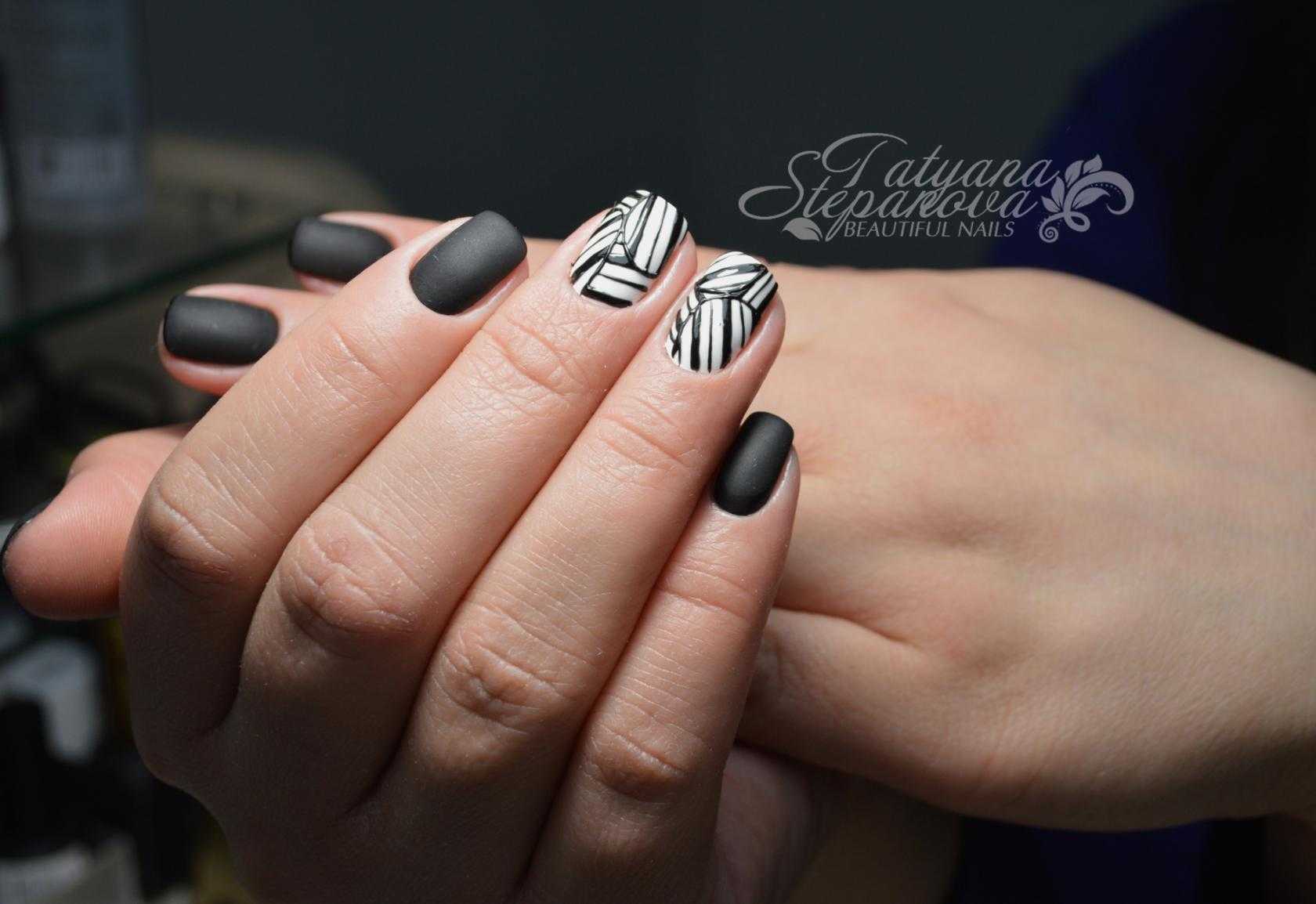 Востребован всегда, ведь он универсален и подходит всем без исключения. Он отлично впишется в офисную обстановку. Если же существует необходимость придать такому модному маникюру праздничную нотку, то его можно дополнить декоративными элементами, например, блестками или стразами. Зачастую, мастера выбирая черно-белую гамму, имитируют шкуру зебры, при чем полоски могут быть любыми: волнистыми, прямыми, горизонтальными или вертикальными. Также оригинально смотрится на ногтях «шахматная доска», таким рисунком можно украсить лишь 1-2 ногтя, остальные же покрыть черным гель-лаком.