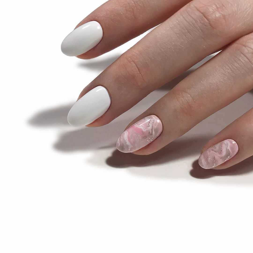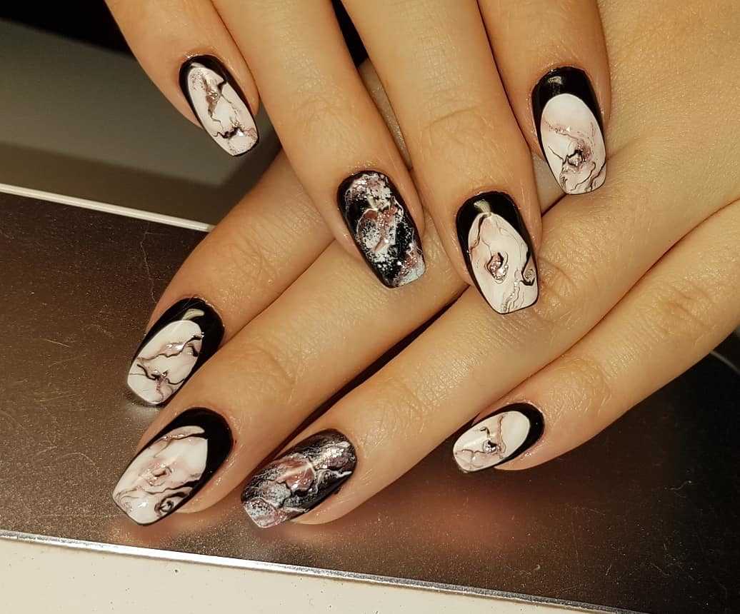 Мраморный маникюр – нежное и стильное решение для длинных миндальных и квадратных ногтей. На черном фоне мраморный узор выглядит интереснее и ярче. Для создания такого нейл-арта обычно используется разбавленный белый гель-лак и глиттер. Визуально маникюр действительно напоминает природную естественную текстуру камня. Плавные переходы белого оттенка и глиттера сглаживают насыщенный черный цвет, поэтому такой маникюр не выглядит броско и навязчиво.