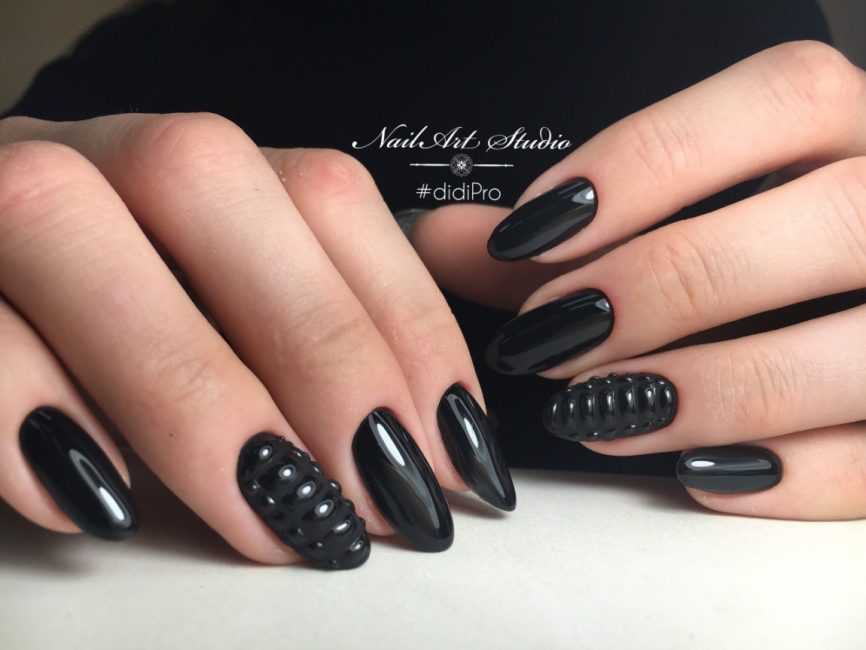 Для особо торжественных случаев мастера маникюра предлагают черный маникюр с объемным декором. Для создания такого маникюра придется освоить азы лепки, с помощью которой на черных ноготках распустятся орхидеи и настоящие розы.