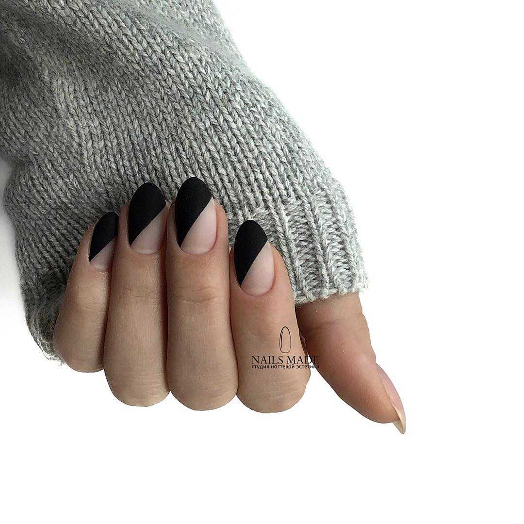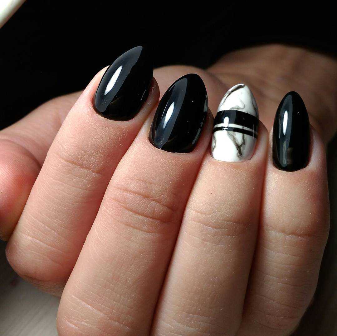 Воплощает женственность и выглядит максимально естественно. Черный цвет на овальной форме ногтей не рискует показаться вызывающим, ведь насыщенность цвета будет приглушаться обтекаемыми формами.
