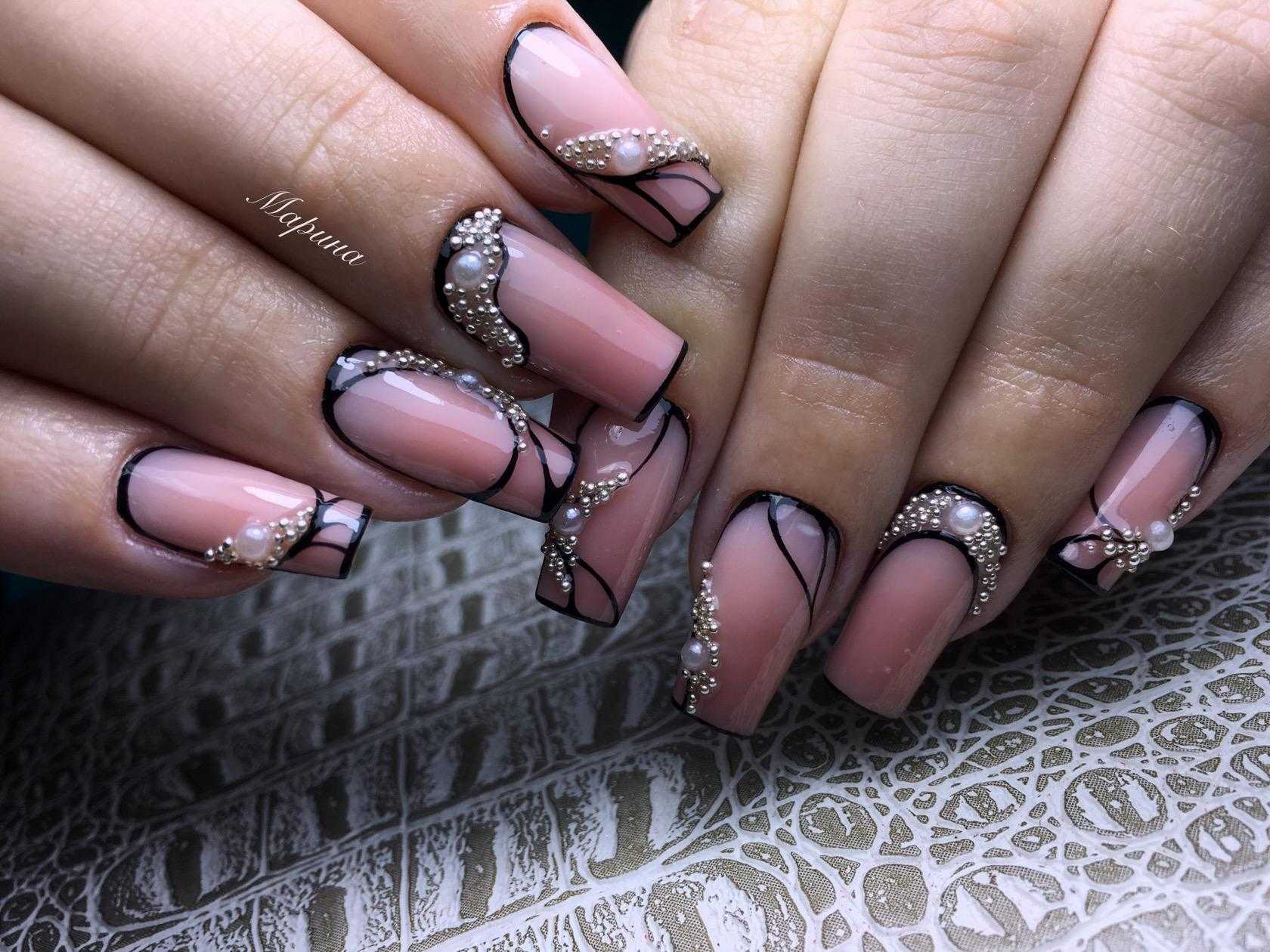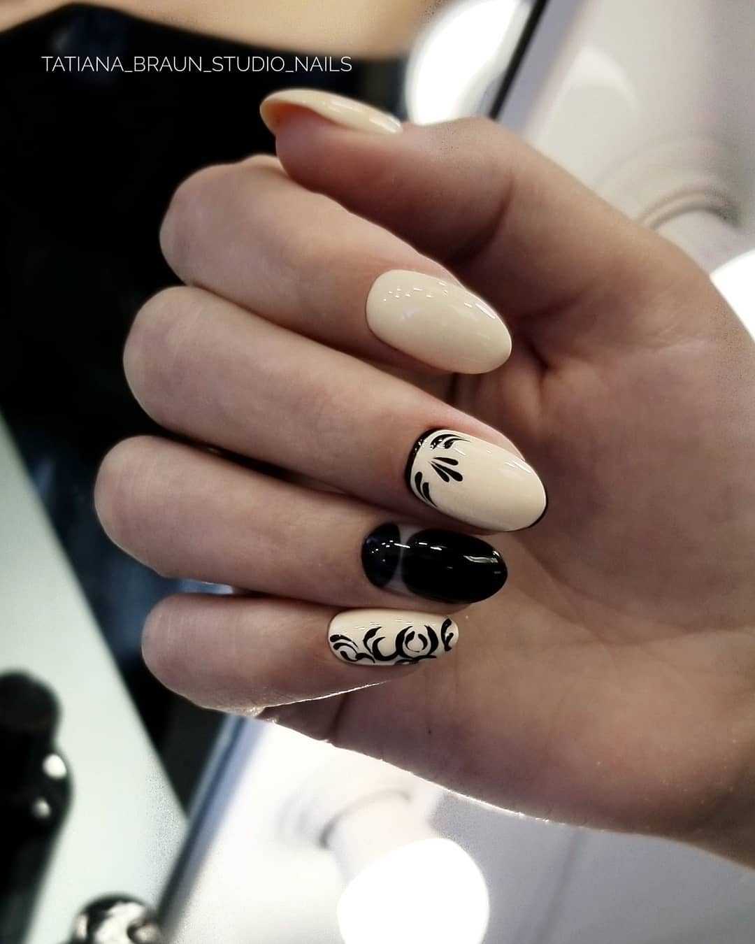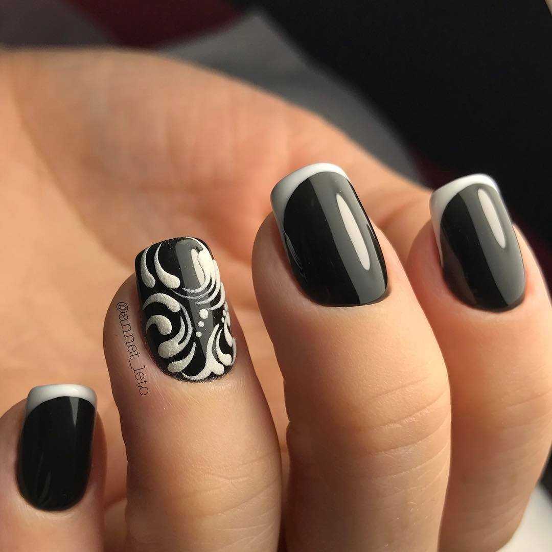 Маникюр с черным лаком и с дизайном. Дизайн может быть любой. Это могут быть узоры, вензеля, различные завитушки.