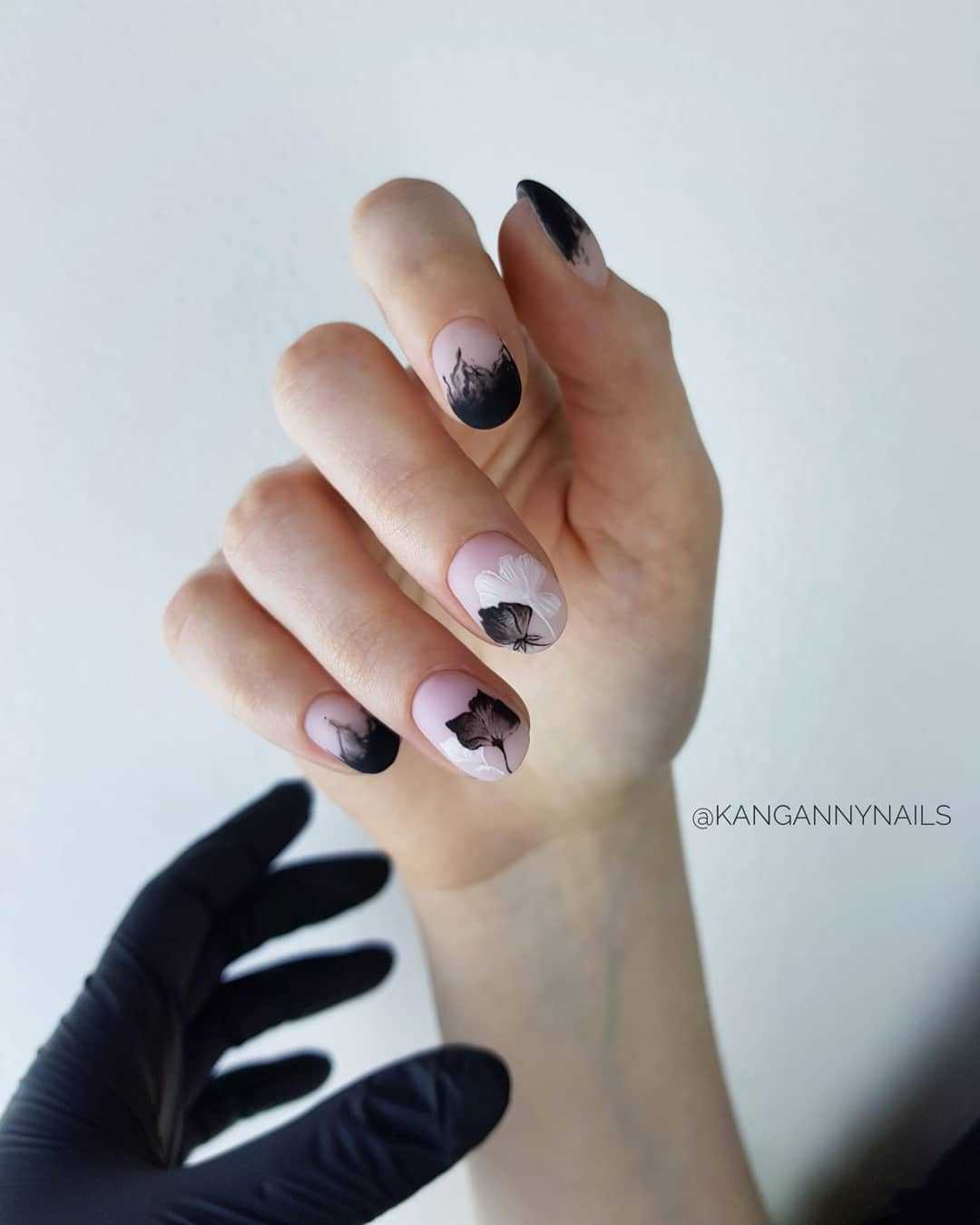 Стильным и романтические девушки любят выбирать черный маникюр с настоящими цветами. Нет, вы не подумайте, живые цветы на ногти не приклеивают. Мастер нейл-арта прорисовывает каждый лепесток и листик максимально четко и аккуратно, что в итоге создает вид максимальной натуральности и реалистичности цветов.