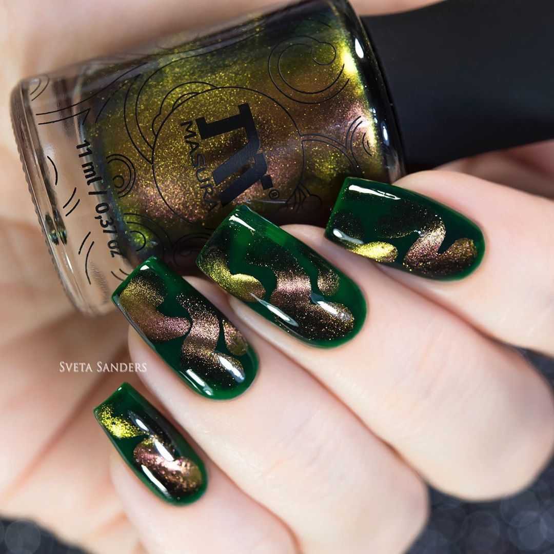 Оформление ноготков в стиле кошачий глаз представляет собой однотонное покрытие, способное отражать свет под разными углами. И создаётся подобный эффект благодаря входящим в состав покрытия мельчайшим частичкам специального маникюрного магнита. Подобное покрытие достаточно долго держится и прекрасно сочетается с блестящим декором. Что касается чёрного маникюра в таком исполнении, то в предложенной технике он получается менее мрачным и просто завораживает глубиной цвета и волшебных переливов, поэтому заслуженно занимает почётное место в списке лидирующих примеров оформления ногтей 2021. Серебристая фольга станет прекрасным решением для оттиска чёрных ноготков. Жидкий глиттер идеально подходит для нанесения изображений. При помощи мелких камней или бусин можно выложить на нескольких пальчиках несложные узоры. Всё зависит от выбранного материала.