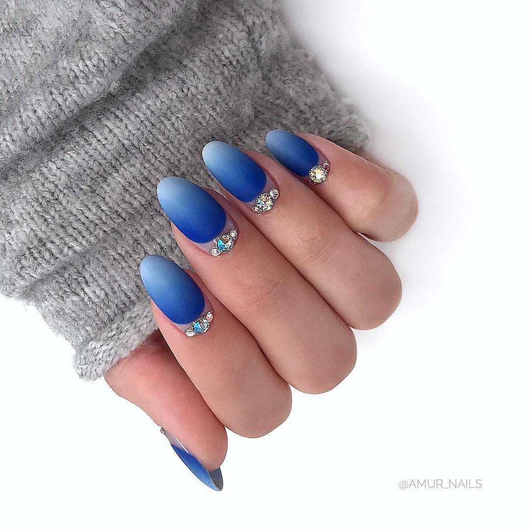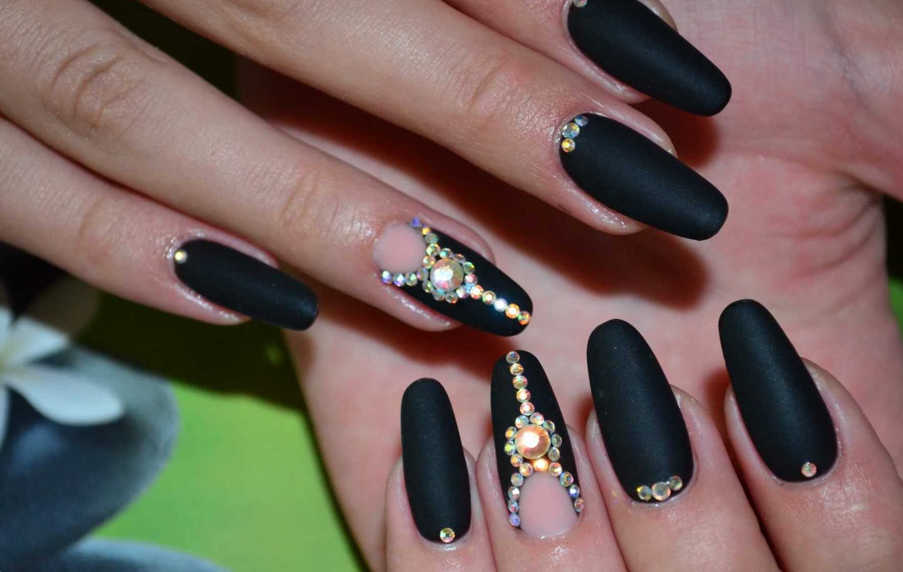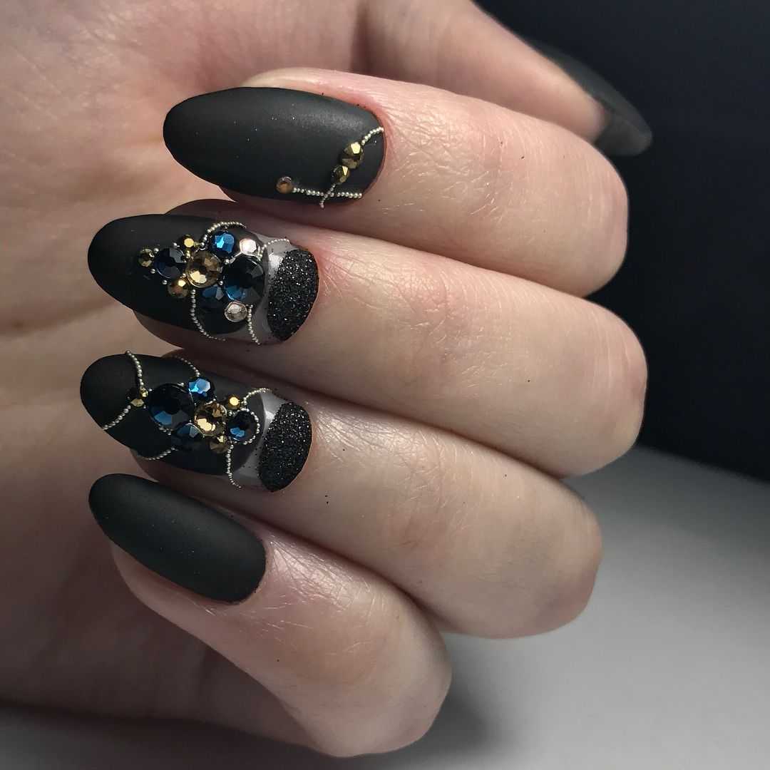 Чёрный бархат на ногтях смотрится особенно шикарно, ведь, как известно матовый топ смягчает любые яркие и тёмные оттенки. Стразы в таком маникюре заметно освежают и облагораживают покрытие. Вы можете расположить блестящие фрагменты в прикорневой зоне одного-двух пальчиков либо украсить бархатистое основание полосками, волнистыми линиями или несложными узорами из стаз. В этом случае следует использовать бульонки, бусины или кристаллы небольшого размера. Наиболее выигрышным тандемом считаются матовый топ и золотистые стразы, но это совсем не означает запрет на использование в маникюре деталей декора другого окраса. Помимо этого, матовые ноготки очень красиво преподносят соседство стразов с блёстками глиттера и пайетками. В зависимости от количества и вариаций расположения декора, такой нейл-арт станет прекрасным дополнением как торжественного, так и повседневного лука.