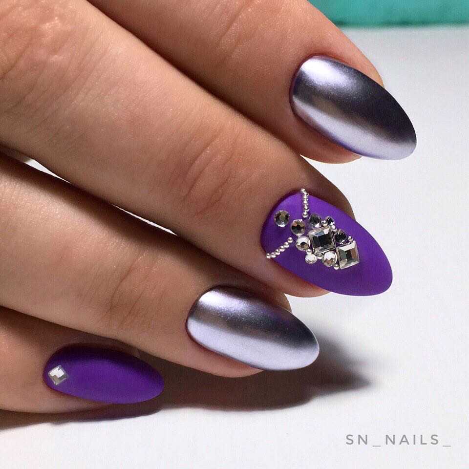 Фиолетовый цвет отлично сочетается с серебряным глиттером, стразами, камнями, бульонками и другим блестящим декором. Особенно нуждается в блеске матовый фиолетовый маникюр, который в однотонном варианте смотрится тускло и банально.