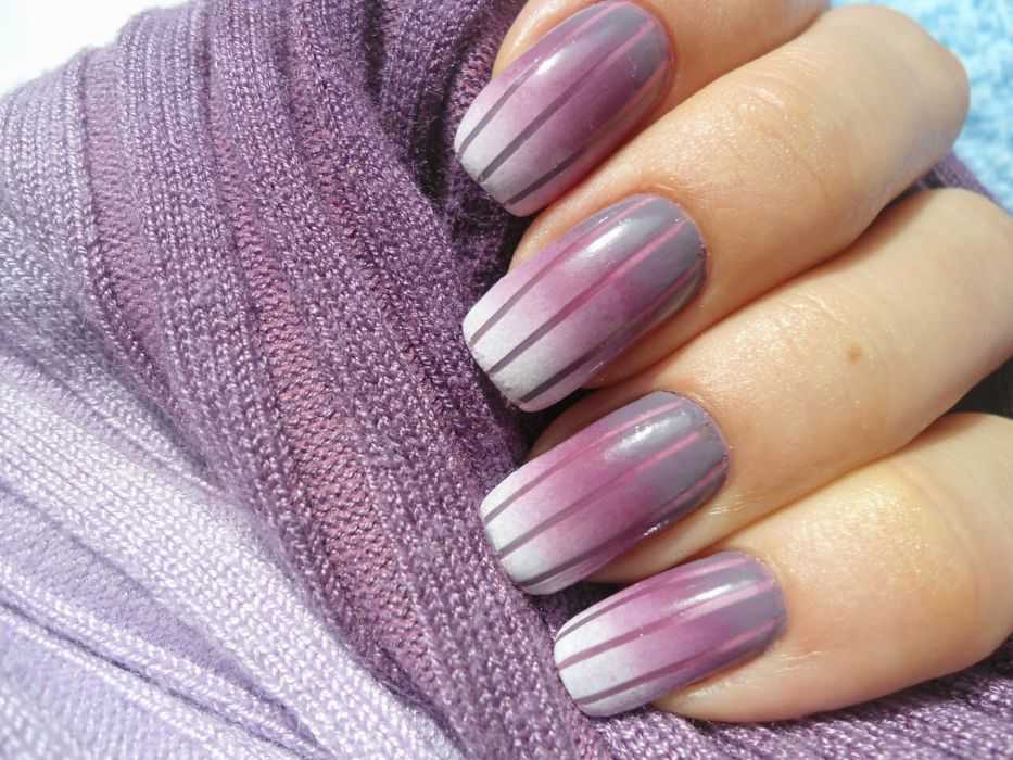 Сделать такой дизайн можно при помощи обычной губки. Также иногда в домашних условиях девушки используют макияжный спонжик. На губку наносят несколько полосок лака, идущих параллельно друг другу, а затем переносят все на ногти. Лак отпечатывается на пластинках и получается красивый переход. Главное условие – грамотно подобрать все оттенки.