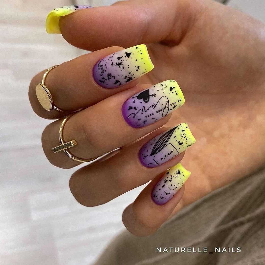 В примере сочетания солнечного жёлтого и сиреневого предпочтительно выбирать из оттенков пастельной палитры, что позволит немного сгладить яркость первого и подчеркнёт нежность второго из используемых тонов. Нанесите жёлтый на пару ноготков и дополните основание бусинами, мелкими стразами, узорами в стиле «перепелиных яиц» или «брызги красками». Ваши ручки с таким маникюром не останутся без внимания.