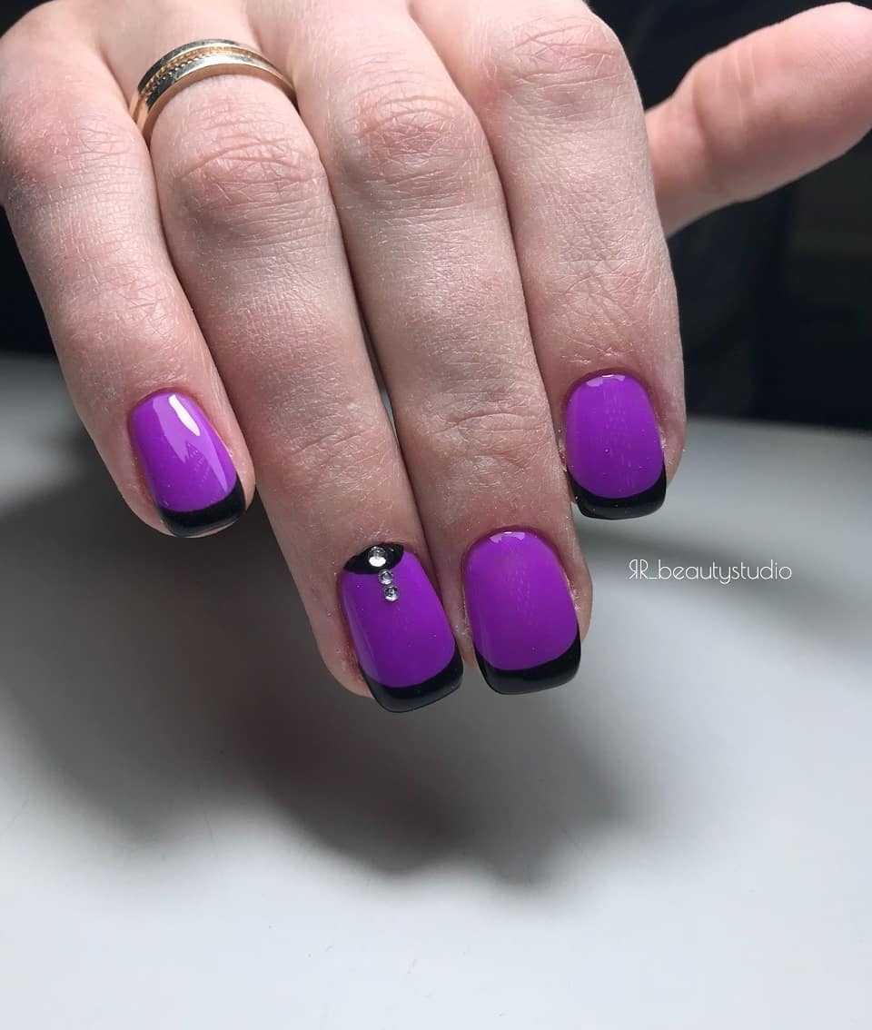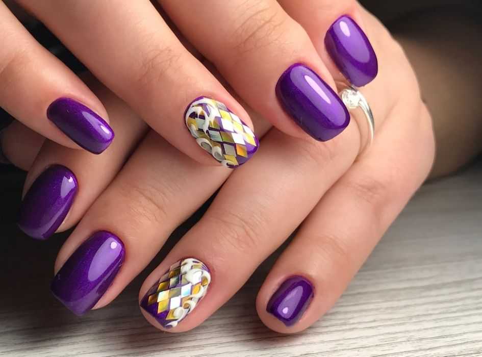 Когда речь заходит о длине ногтей, старайтесь отдать предпочтение более удобному варианту для вашей повседневной жизни. Самыми распространёнными и удобными считаются короткие ногтевые пластины. Сочетание с модным фиолетовым маникюром – это просто находка для всех модниц! Нанесите один из фиолетовых тонов, которые просто изумительно смотрятся на коротких ногтях. При этом можно выбирать абсолютно любые цвета. Здесь нужно отталкиваться от вашего настроения и фантазии. Очень красиво смотрятся не только монохромные композиции, но и варианты с добавлением различных цветов и декоративных элементов.