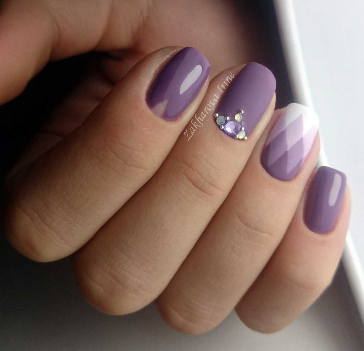 Это предложение станет идеальным выбором для тех, кто ещё не раскрыл для себя особенности сиреневого оттенка или считает однотонное покрытие слишком «приторным». Покройте нейтральным белым несколько ногтевых пластин и дополните их парой блестящих кристаллов или модными слайдерами. Таким образом вы измените используемую ранее концепцию и освежите ноготки.