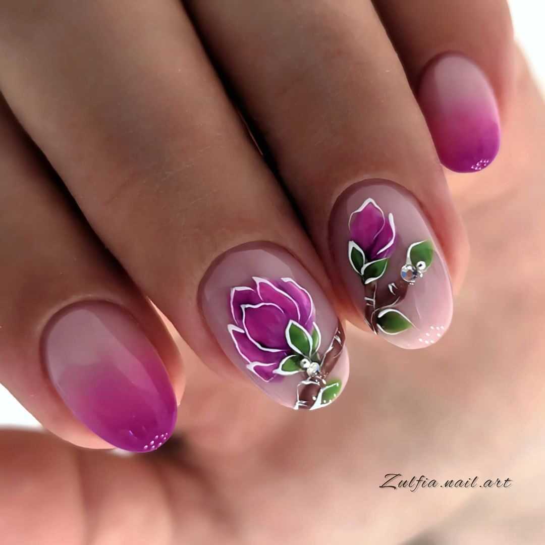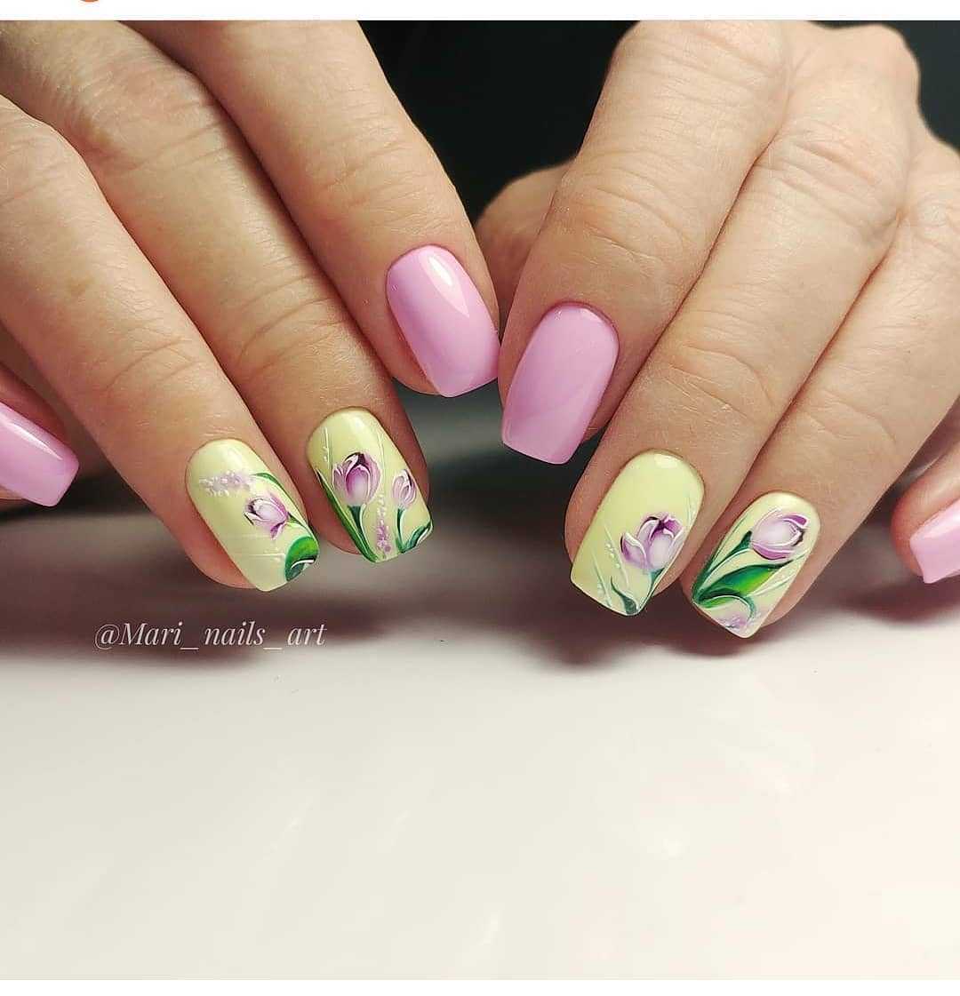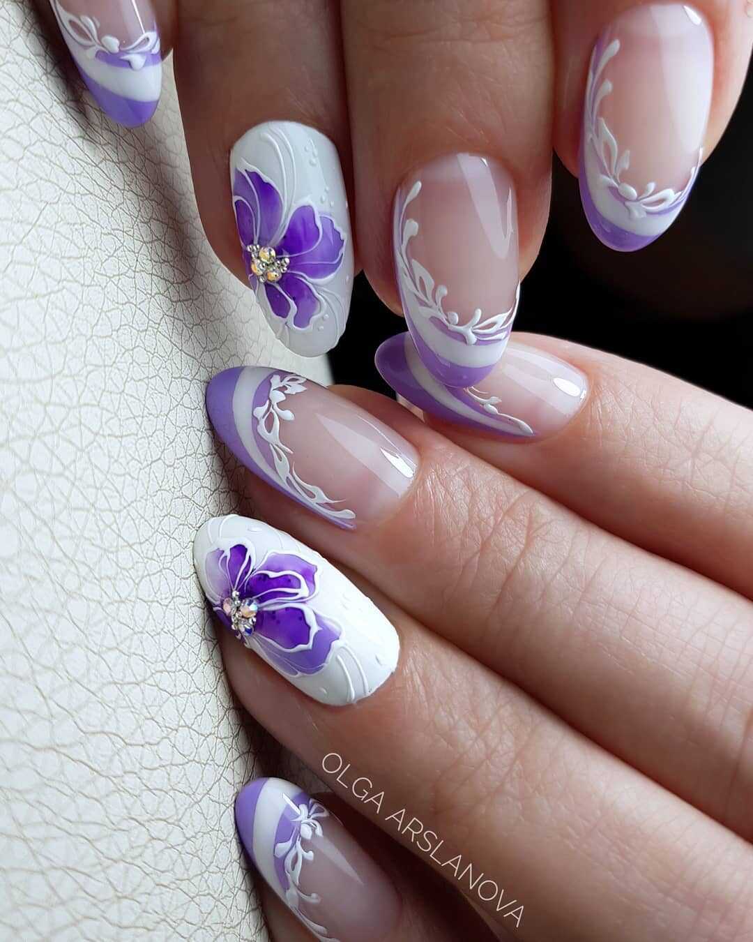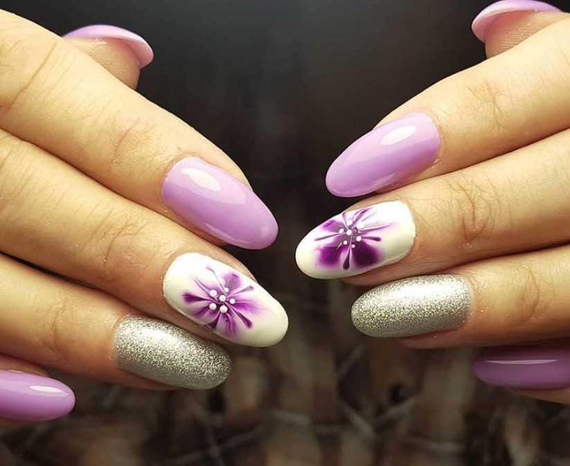 Сиреневый цвет отлично будет смотреться с цветочными композициями на ногтях. Смело просите мастера в маникюрном салоне рисовать нежные бутоны на ваших ногтях