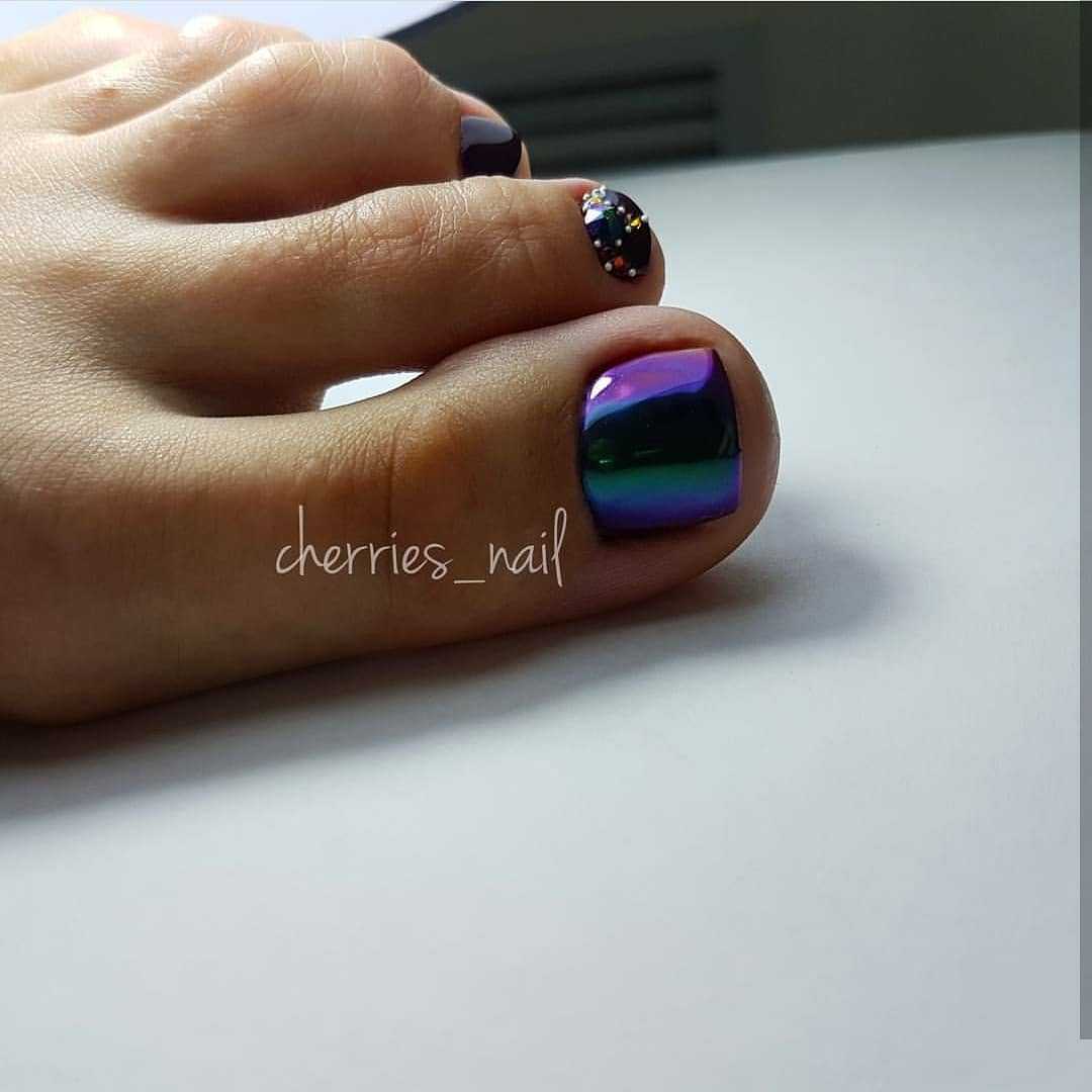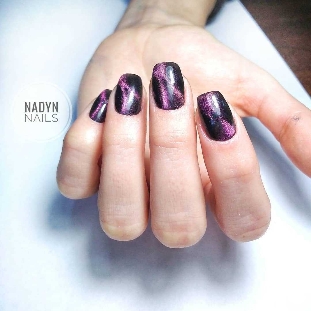 Металлизированные поверхности с фиолетовым отливом — безусловный тренд 2021 года. Обладательницы длинных острых ноготков с формой «пуанты» или «пики» могут выбирать, как темные, так и светлые переливающиеся пигменты. Чем короче ногтевые пластинки, тем светлее и сдержаннее должен быть цвет металлизированного покрытия.
