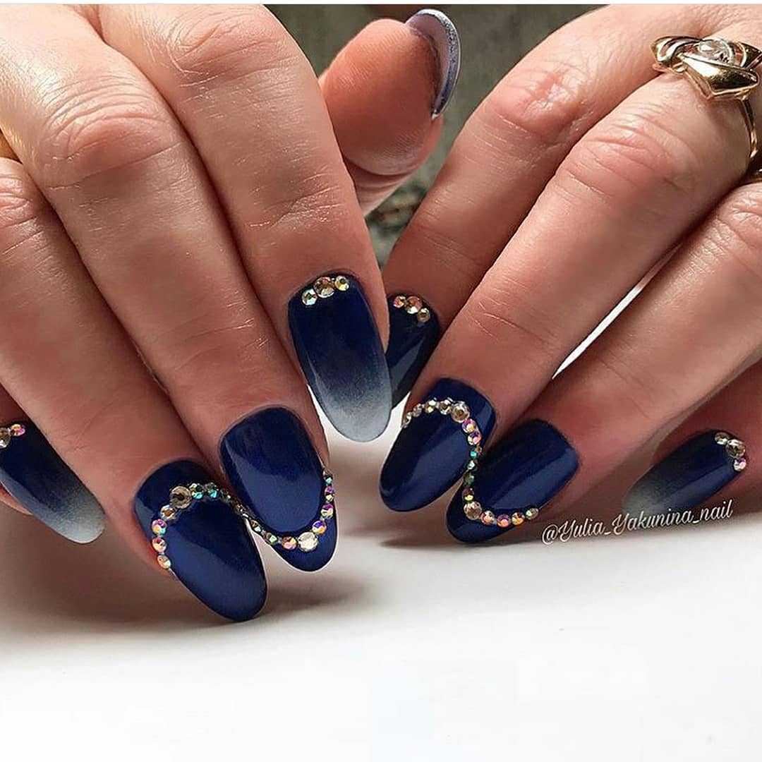 - декор стразами – могут дополнять однотонный глянцевый и матовый маникюр. В тренде декор со стразами в прикорневой зоне, инкрустация стразами одного ноготка.