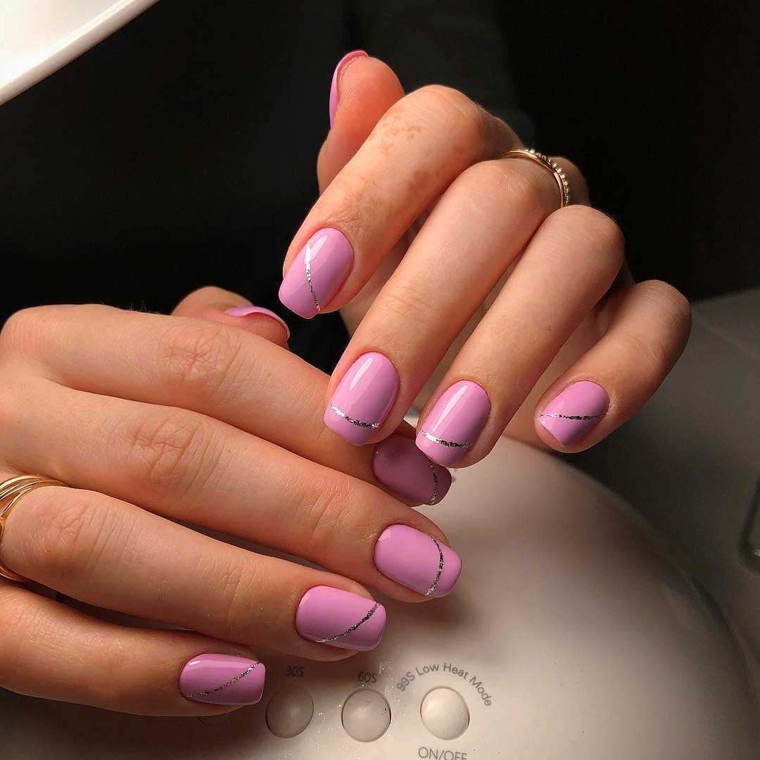 Оттенки у сиреневого маникюра совсем не скучные, они подойдут и для однотонного покрытия. Хорошо будут смотреться также матовые сиреневые ногти. А элегантным элементом дизайна могут стать серебристые полоски или лунки.