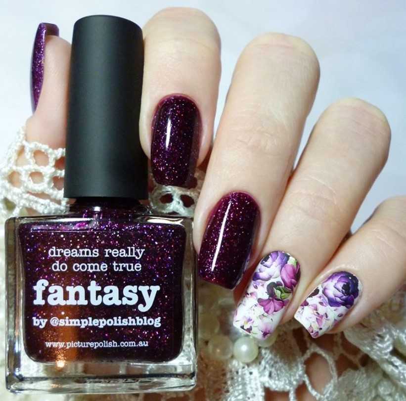 Одно из лидирующих мест в дизайне фиолетовых ноготков занимают цветочные узоры. Модными в этом сезоне стали одиночные бутоны, цветочные композиции и стилизованные орнаменты в этой тематике. Цветочные букеты всегда дополняют образ женственностью и добавляют мягкости в образ любой модницы. Некоторые изображения поистине выглядят как настоящие шедевры искусства, ведь ничто не может быть роскошнее, например, распускающихся весенних цветов на ваших ноготках! Чудесным выбором для настоящей леди станет букет фиалок. Наносить цветочные узоры очень актуально техникой стемпинг или «вуаль», при которой мастер выводить фиолетовыми лаками цветы на прозрачной основе. Все цветочные композиции выполняют близкими по цвету или контрастными оттенками лака, в зависимости от задуманного варианта.