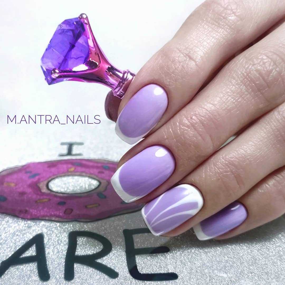 При использовании нежного сиреневого тона для выполнения французского маникюра необходимо задуматься о дополнительном декоре. Чаще всего модницы выбирают рисунки. Самым распространенным вариантом считаются флористические мотивы. Цветочный узор сделает дизайн более нежным, изящным и утонченным. Не менее привлекательно смотрятся и геометрические фигуры, создавая некий контраст. Такой маникюр станет лучшим вариантом для деловых леди