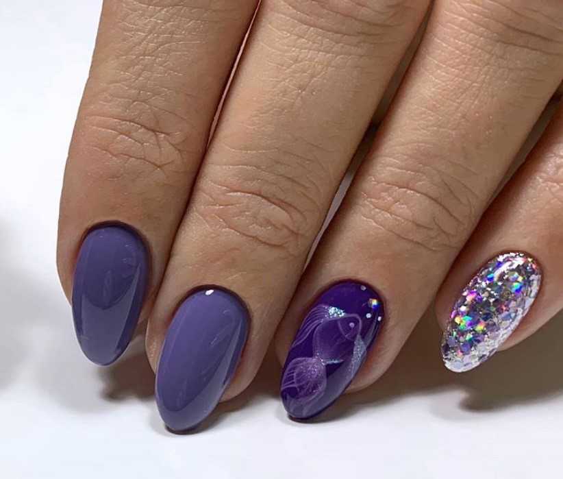 - однотонное покрытие ногтей фиолетовым гель-лаком и серебряным глиттером – глиттер чаще всего располагается на безымянном пальце