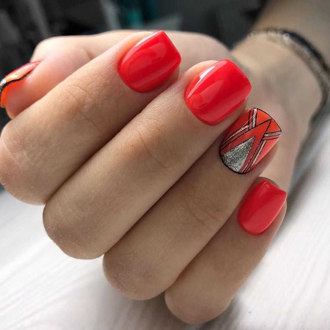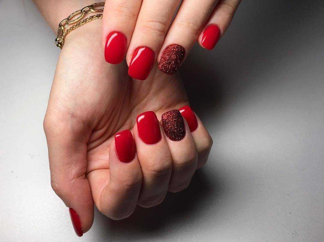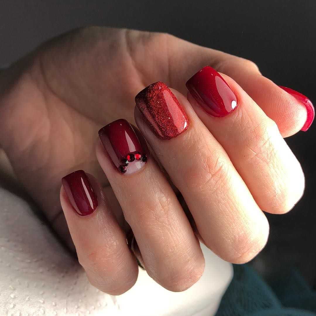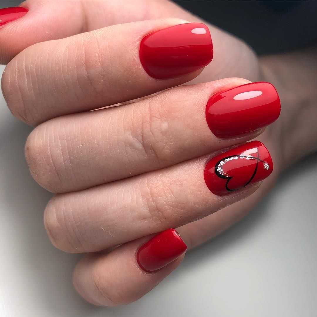 Для обладательниц коротких или очень коротких ноготков, подойдет красный дизайн с небольшим количеством блесток или страз, или с аккуратным рисунком на одном или двух ноготках.