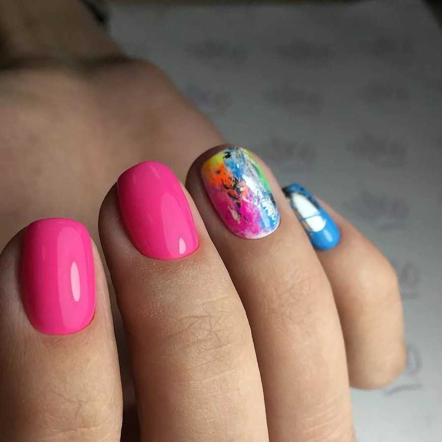 - Модным решением в маникюре могут стать яркие цвета в сочетании с дизайнами.