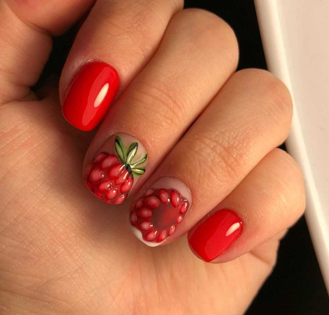 Очень красиво и оригинально смотрятся рисунки фруктов и ягод в сочетании с красным дизайном. Но, такой вариант дизайна более подойдет для летнего маникюра.