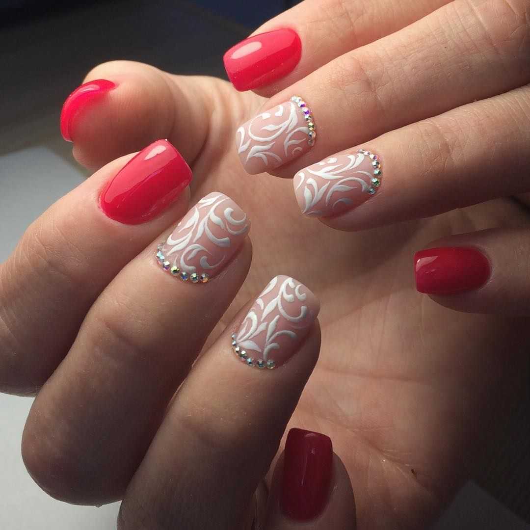Вторым по-популярности, в этом сезоне является красный маникюр с различными рисунками. Это самое востребованное и желанное сочетание — вне моды и времени. Как мы знаем, красные ноготки любит большая часть прекрасной половины человечества, и рисунки на ноготках предпочитает не меньшее их количество.