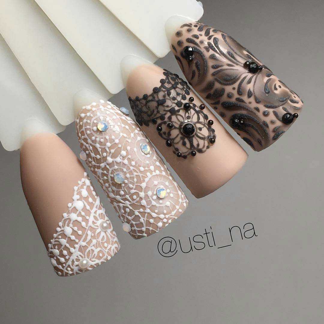 Красиво и празднично выглядит и кружевной дизайн ногтей. Такой маникюр смотрится красиво как в черно-белой, так и в светлой бежевой цветовой гамме. Кружево на ногтях выполняется несколькими способами. Самый простой – наклейки. Также продается множество стемпинг-пластин с кружевным рисунком. Третий вариант – использовать кружевную ткань, причем можно непосредственно приклеить ее на лаковую основу и зафиксировать несколькими слоями топа, а можно использовать ткань в качестве трафарета. С помощью этих достаточно простых способов сделать кружевной маникюр на 8 марта можно даже в домашних условиях, если у вас нет времени добежать до салона.