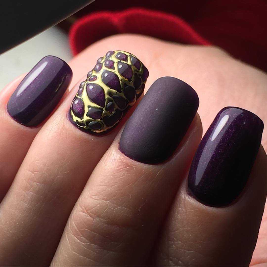 Главная тенденция предстоящего сезона – матовый маникюр. Его можно выполнить как в однотонном варианте, так и сочетать с глянцевым покрытием. Богато и изящно смотрится матовый нейл-дизайн в темных оттенках – синем, фиолетовом и бордовом.